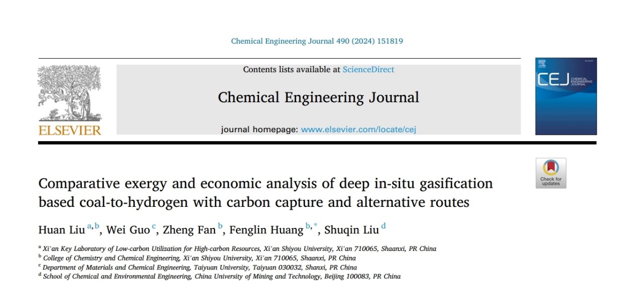 近日,我?;瘜W(xué)化工學(xué)院黃風(fēng)林科研團(tuán)隊(duì)以青年教師劉歡為第一作者、黃風(fēng)林為通訊作者,西安石油大學(xué)為第一署名單位在工程技術(shù)與化工領(lǐng)域最有影響力的三大頂級(jí)刊物之一《Chemical Engineering Journal》(JCR、中科院分區(qū)雙一區(qū)TOP期刊,IF=15.1)上發(fā)表題為《Comparative exergy and economic analysis of deep in-situ gasification based coal-to-hydrogen with carbon capture and alternative routes》的高水平論文。