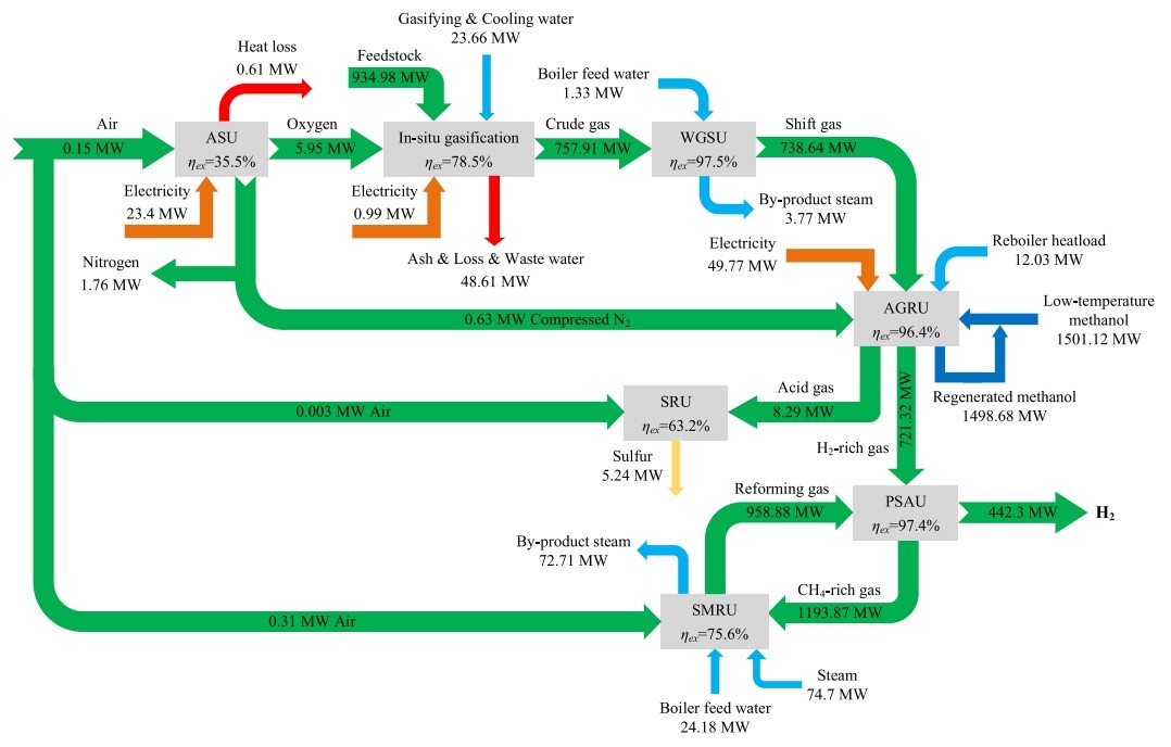 深部煤炭原位氣化制氫作為一種潛在的規(guī)模化技術(shù)路線,工業(yè)化應(yīng)用前利用熱力學(xué)手段分析其能量轉(zhuǎn)化、利用過程的特點(diǎn),預(yù)測(cè)系統(tǒng)用能的薄弱環(huán)節(jié),可為后續(xù)工藝過程、工藝參數(shù)耦合優(yōu)化提供指導(dǎo)。與現(xiàn)有基于化石能源路線間效率、經(jīng)濟(jì)性等方面的定量化分析是提高競(jìng)爭(zhēng)力,明確技術(shù)可行性與應(yīng)用前景的核心關(guān)鍵。