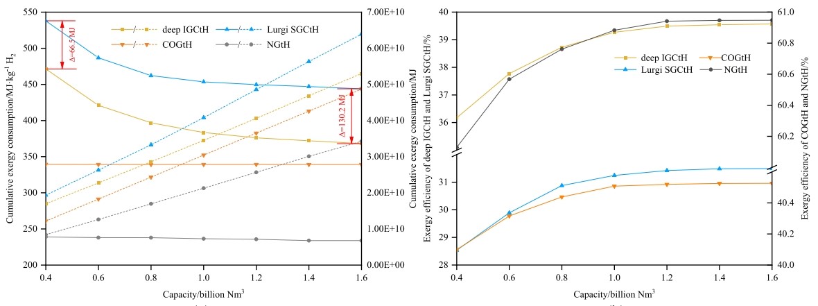 該成果基于世界上唯一的千米級(jí)深部煤炭原位氣化試驗(yàn)數(shù)據(jù),運(yùn)用?分析方法,以?平衡方程為基礎(chǔ),結(jié)合過程模擬手段,計(jì)算了深部煤炭原位氣化制氫從原煤開始到氫氣產(chǎn)品產(chǎn)出的?損失、分布,將?損失細(xì)分為可避免/不可避免內(nèi)部損失與可避免/不可避免外部損失四類,進(jìn)一步分析用能薄弱環(huán)節(jié),確定提高?效率的方法、手段。同時(shí),針對(duì)傳統(tǒng)?分析方法視角下效率指標(biāo)存在?不等價(jià)與無法計(jì)入非連續(xù)投入能量等問題,創(chuàng)新提出以考慮設(shè)備因素的積累?消耗(CExC)作為衡量過程?效率的指標(biāo),據(jù)此明確深部煤炭原位氣化制氫在效率方面的競(jìng)爭(zhēng)力。結(jié)果表明,深部煤炭原位氣化制氫?損失中存在39.9%的不可避免,而甲烷重整和深部地下氣化具有最大的改進(jìn)潛力,充分說明通過改進(jìn)其他過程單元或優(yōu)化工藝結(jié)構(gòu)可實(shí)現(xiàn)熱力學(xué)性能的改善。在產(chǎn)出每千克氫氣時(shí)深部煤炭原位氣化制氫的CExC僅為傳統(tǒng)煤炭地面氣化制氫的83.6%,表明其是一種更高效的路線,優(yōu)勢(shì)隨著規(guī)模的增大會(huì)更加明顯,同時(shí)投資、成本方面相比后者也具有顯著優(yōu)勢(shì)。
