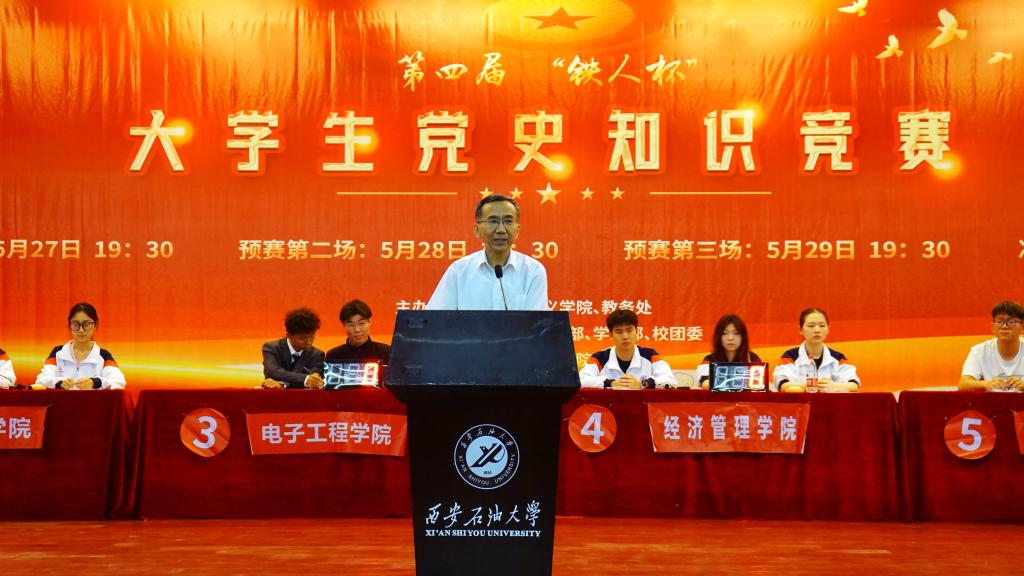 6月3日晚,由我校馬克思主義學院、教務處主辦,黨委組織部、黨委宣傳部、黨委學生工作部和校團委協(xié)辦的第四屆“鐵人杯”大學生黨史知識競賽決賽在鄠邑校區(qū)騰輝大學生活動中心隆重舉行。校黨委副書記張木出席并講話,學校相關部門及院(系)負責人、馬克思主義學院教師及300余名學生現(xiàn)場觀摩競賽。