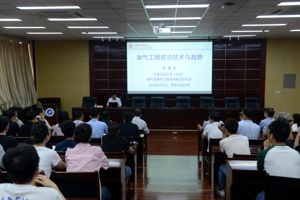 李根生院士圍繞當(dāng)前油氣工程前沿技術(shù)與發(fā)展趨勢(shì)為在場(chǎng)師生帶來(lái)了一場(chǎng)精彩的學(xué)術(shù)報(bào)告。李院士表示,深井、復(fù)雜結(jié)構(gòu)井是高效開(kāi)發(fā)復(fù)雜油氣的關(guān)鍵技術(shù),鉆井技術(shù)的發(fā)展已從牙輪鉆井等萌芽階段發(fā)展至目前的智能化鉆井階段,新型射流鉆完井、地質(zhì)-工程一體化、智能油氣工程的發(fā)展對(duì)保障我國(guó)能源安全起著至關(guān)重要的作用。李院士詳細(xì)從深井空化射流鉆井理論與技術(shù)、空化射流處理地層方法與應(yīng)用、水力噴射分段壓裂理論與技術(shù)、水力噴射徑向井立體壓裂研究方面對(duì)新型射流鉆完井技術(shù)作了詳細(xì)講解,并一一介紹了現(xiàn)場(chǎng)應(yīng)用情況與取得成果。李院士還從地質(zhì)-工程一體化和智能油氣工程方面存在的關(guān)鍵科技問(wèn)題與主要任務(wù)方面為在場(chǎng)師生進(jìn)行了講解。報(bào)告最后,李院士提到,地質(zhì)-工程智能化是目前的前沿?zé)狳c(diǎn)和行業(yè)發(fā)展趨勢(shì),必須抓住戰(zhàn)略機(jī)遇期,加快戰(zhàn)略布局和攻關(guān)力度,實(shí)現(xiàn)跨越式發(fā)展,另外要探索產(chǎn)學(xué)研協(xié)同創(chuàng)新機(jī)制和油氣人工智能復(fù)合型人才培養(yǎng)模式,實(shí)現(xiàn)“學(xué)以致用、用以促學(xué)、學(xué)用相長(zhǎng)”。