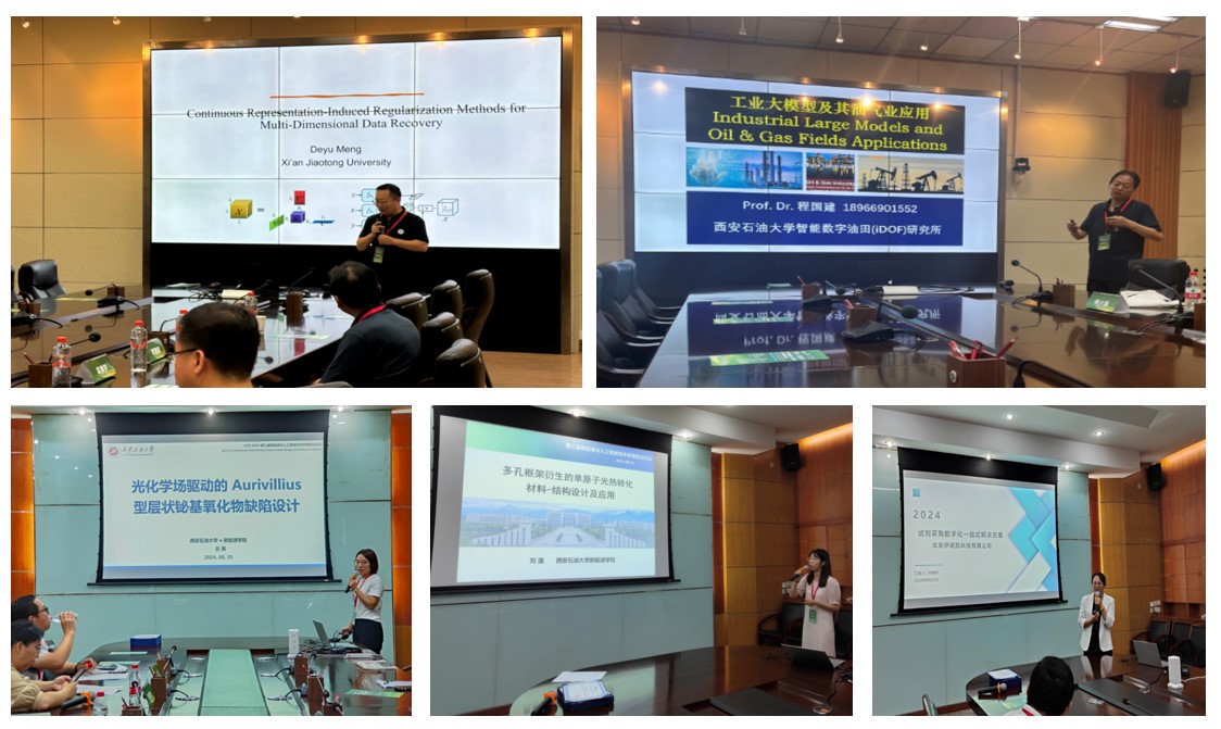 在“新能源+ ”“人工智能+ ”兩個(gè)分論壇中,來(lái)自西安交通大學(xué)、西安理工大學(xué)及我校的32名師生做了專題報(bào)告,報(bào)告由折延宏、高國(guó)旺、肖美霞、安敏榮、王磊、呂英、畢佳穎、劉潼八位教師主持。國(guó)家級(jí)高層次人才、西安交通大學(xué)孟德宇教授做了題為“Continuous Representation-Induced Regularization Methods for Multi- Dimensional Data Recovery”的報(bào)告;我校程國(guó)建教授做了題為“工業(yè)大模型及其油氣業(yè)應(yīng)用”的報(bào)告;我校呂英副教授做了題為“光化學(xué)場(chǎng)驅(qū)動(dòng)的Aurivillius型層狀鉍基氧化物缺陷設(shè)計(jì)”的報(bào)告;我校青年教師劉潼做了題為“多孔框架衍生的單原子光熱轉(zhuǎn)化材料-結(jié)構(gòu)設(shè)計(jì)及應(yīng)用”的報(bào)告。另外,西安建筑科技大學(xué)、廈門理工學(xué)院、北京伊諾凱科技有限公司等單位及我校研究生做了28個(gè)專題報(bào)告。