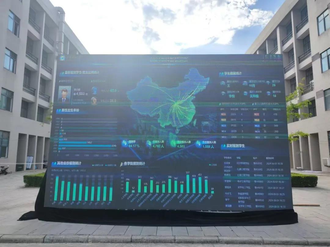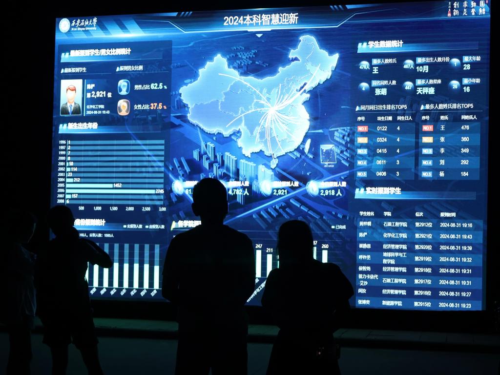 迎新現(xiàn)場設(shè)立了網(wǎng)絡(luò)可視化大數(shù)據(jù)電子屏幕,實時呈現(xiàn)全校本科新生報到情況,包含學(xué)生基本信息、所在省份,及有多少人與該名同學(xué)來自相同的省份、高中、相同的生日、姓氏、名字等有趣的信息,直觀展現(xiàn)出新生從祖國各地匯聚到西安石油大學(xué)的震撼場面。