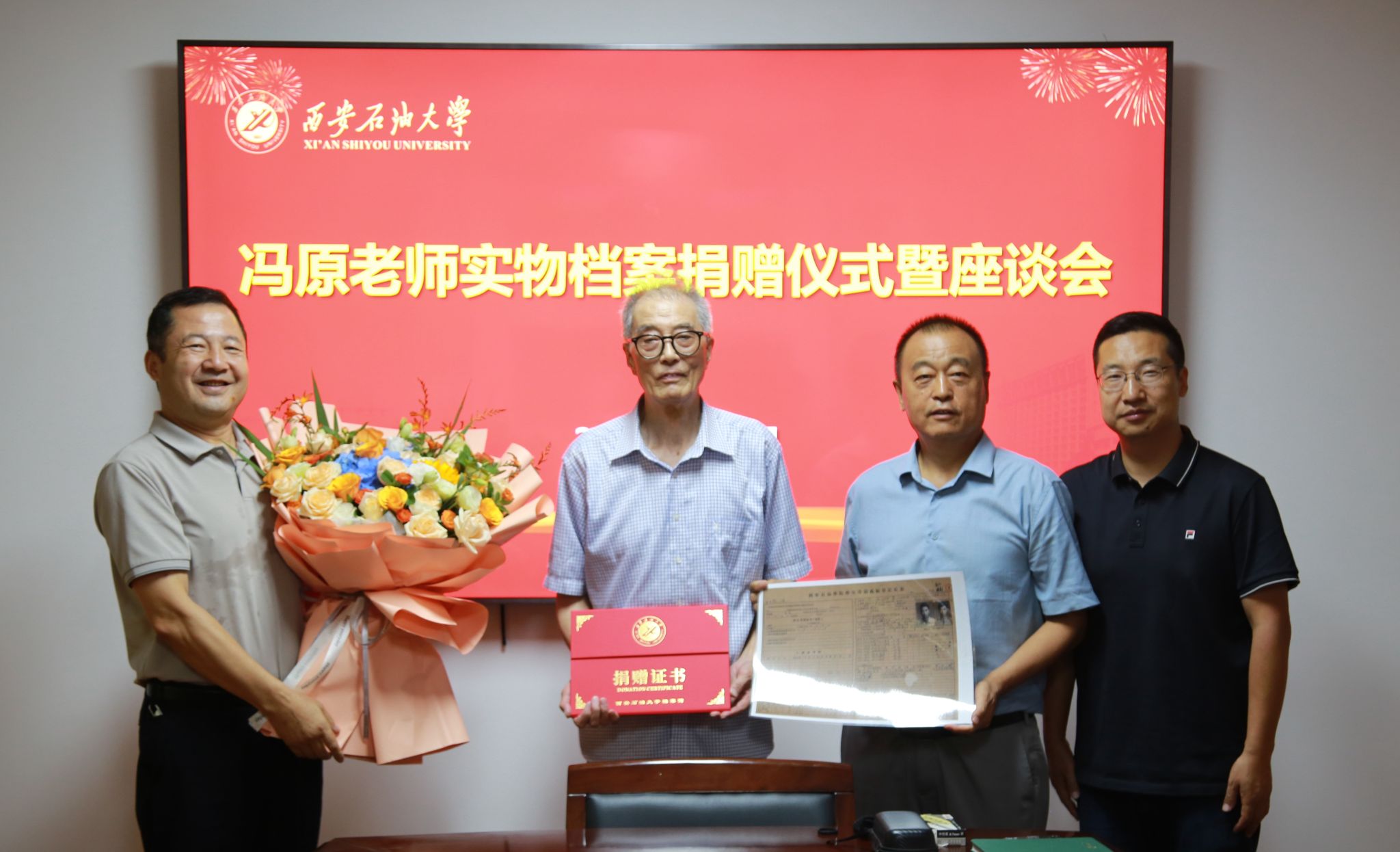 程永清強(qiáng)調(diào),馮老師是學(xué)校的老校友,是我們的老前輩,其懷著對(duì)學(xué)校無比真摯的感情將一批珍貴實(shí)物檔案捐贈(zèng)給檔案館,我們一定要保護(hù)好、利用好,銘記老一代西石大人對(duì)學(xué)校的貢獻(xiàn)。程永清代表學(xué)校感謝馮老師對(duì)學(xué)校的關(guān)愛。他表示,老同志們對(duì)學(xué)校的發(fā)展給予厚望,我們一定要接好接力棒,擔(dān)負(fù)起歷史使命,大力傳承紅色血脈,發(fā)揚(yáng)西安石油大學(xué)老一代教師的優(yōu)良品質(zhì),講好西安石油大學(xué)故事,為早日將學(xué)校建成特色鮮明高水平教學(xué)研究型大學(xué)而努力奮斗。