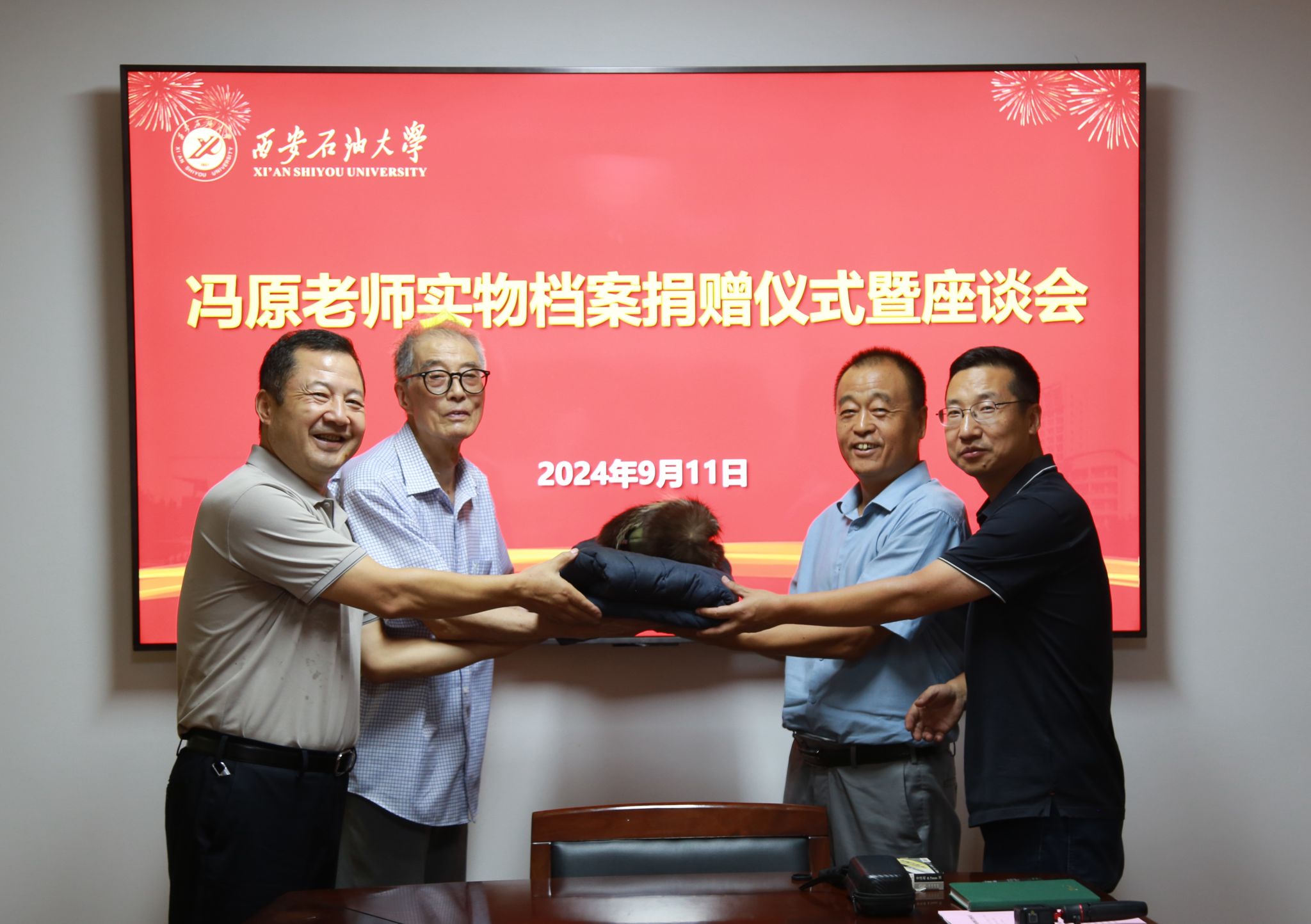 9月11日下午,我校退休教職工馮原老師向?qū)W校捐贈(zèng)“新時(shí)期鐵人”王啟民為校慶50周年題詞、大慶會(huì)戰(zhàn)期間的工服鞋帽、西安石油學(xué)院畢業(yè)證書、老照片等珍貴實(shí)物檔案。檔案捐贈(zèng)儀式在雁塔校區(qū)行政樓二樓會(huì)議室舉行,會(huì)議由檔案館館長(zhǎng)馬超主持,校黨委副書記程永清,離退休工作處主要負(fù)責(zé)人及相關(guān)工作人員參加會(huì)議。