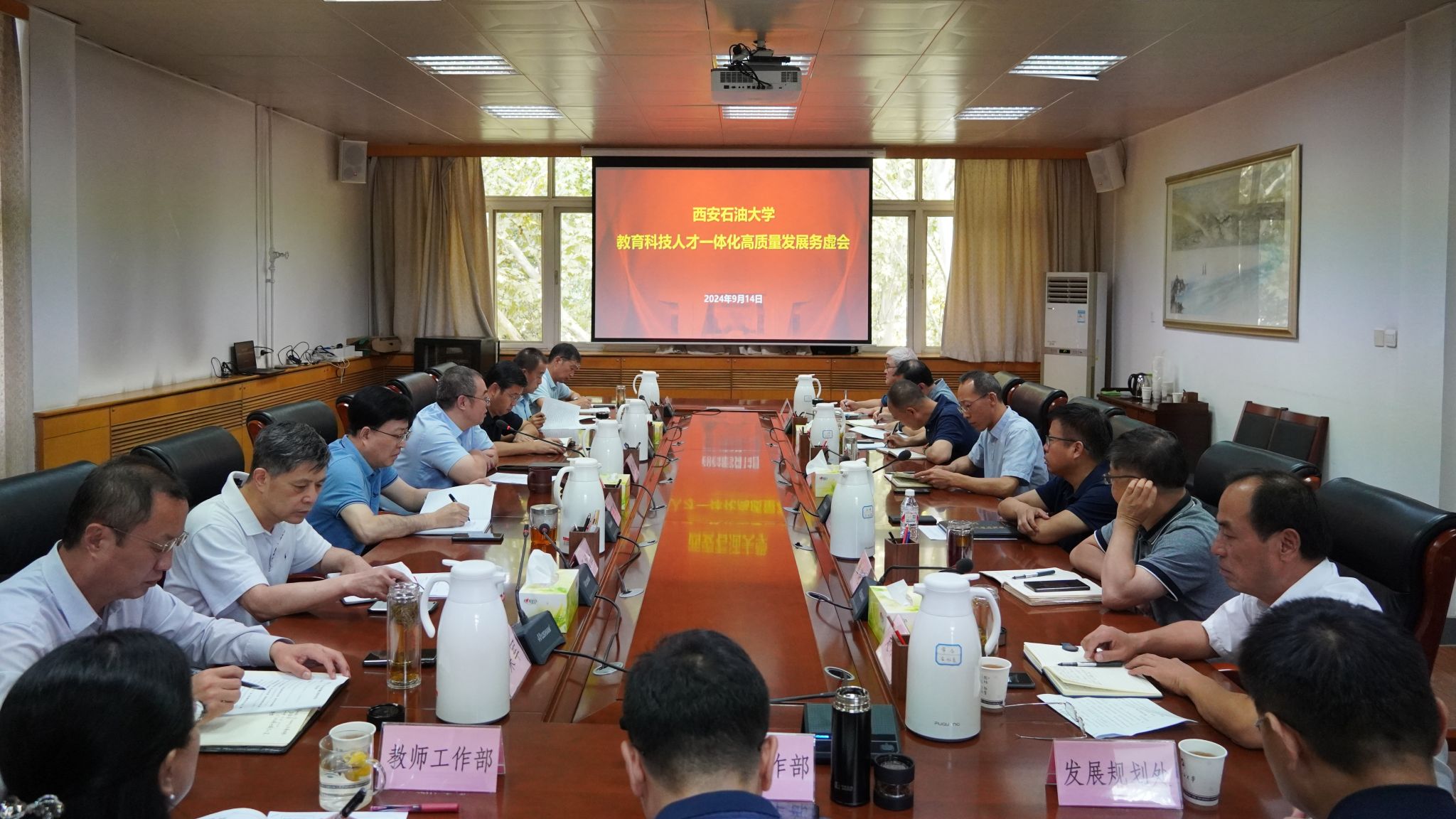 9月14日上午,我校教育科技人才一體化高質(zhì)量發(fā)展務(wù)虛會(huì)在雁塔校區(qū)行政樓五樓會(huì)議室召開。學(xué)校黨政領(lǐng)導(dǎo)常江、王進(jìn)富、王輝強(qiáng)、程永清、楊戰(zhàn)社、蘇文甫、張榮軍、張君濤、張驍勇、趙健、樊曉民出席會(huì)議,校黨委委員種宇宏、趙承勝、吳復(fù)雷參加會(huì)議,會(huì)議由校黨委書記常江主持。