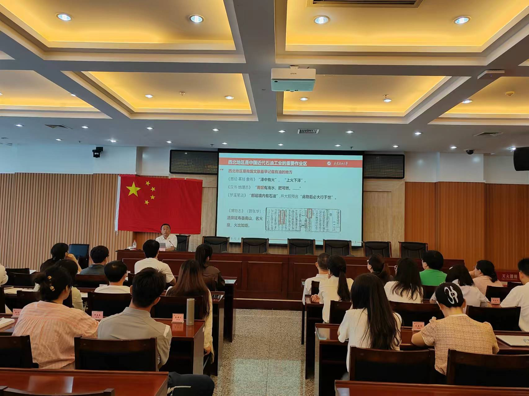 程永清從西北石油工業(yè)學(xué)校時期、西安石油學(xué)院時期、停辦改廠時期、恢復(fù)重建時期、更名西安石油大學(xué)以來等五個時期全面回顧了學(xué)校70余年的發(fā)展歷史,從教學(xué)科研、學(xué)科建設(shè)、人才培養(yǎng)、杰出校友和社會服務(wù)等維度解讀了辦學(xué)精神的深刻內(nèi)涵。他通過一系列珍貴的歷史照片、生動的案例和詳實的數(shù)據(jù),向大家講述了不同時期學(xué)校辦學(xué)歷史上發(fā)生的感人故事。