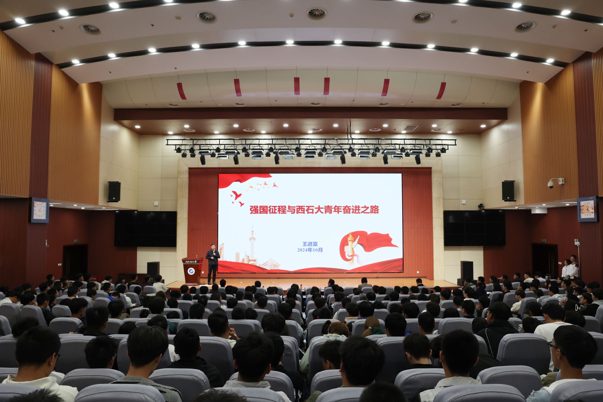 在授課中,王進(jìn)富首先圍繞“新時(shí)代是什么樣的時(shí)代”,向同學(xué)們講授了新時(shí)代“新”在何處,深刻闡釋了中國特色社會(huì)主義進(jìn)入新時(shí)代是我國發(fā)展新的歷史方位。他結(jié)合1989-2022年中國經(jīng)濟(jì)GDP同比增速數(shù)據(jù)、人工智能時(shí)代的到來等實(shí)例,引導(dǎo)師生認(rèn)真思考為什么要建設(shè)社會(huì)主義現(xiàn)代化強(qiáng)國以及強(qiáng)國征程如何實(shí)現(xiàn)。隨后,他從實(shí)現(xiàn)強(qiáng)國征程要深刻認(rèn)識(shí)和把握黨百年奮斗的初心使命入手,闡述了“中國夢”的內(nèi)涵、重要意義及實(shí)現(xiàn)路徑,引領(lǐng)廣大青年從黨的百年歷史中汲取智慧和力量,在接續(xù)奮斗中踐行“請(qǐng)黨放心,強(qiáng)國有我”的錚錚誓言。接著,他細(xì)致講解了中國式現(xiàn)代化的圖景與發(fā)展邏輯、中國式現(xiàn)代化的主要特征及其內(nèi)涵、新質(zhì)生產(chǎn)力的科學(xué)內(nèi)涵與發(fā)展路徑等內(nèi)容,深刻闡釋了以中國式現(xiàn)代化全面推進(jìn)強(qiáng)國建設(shè)、民族復(fù)興和以新質(zhì)生產(chǎn)力發(fā)展推進(jìn)中國式現(xiàn)代化建設(shè)的重要意義。他指出,推動(dòng)新質(zhì)生產(chǎn)力發(fā)展離不開教育、科技、人才的支撐,鼓勵(lì)學(xué)生要努力奮斗,立志成長為行業(yè)精英,為國家油氣勘探開發(fā)提供更前沿、更先進(jìn)的技術(shù)。最后,他深入分析了科技創(chuàng)新面臨的嚴(yán)峻挑戰(zhàn)、產(chǎn)業(yè)安全面臨的重大風(fēng)險(xiǎn)、大學(xué)正在遭遇深度困境、人才培養(yǎng)亟待深刻變革、快速持續(xù)的變化與傳統(tǒng)體系的矛盾凸顯、未來的人才需求與現(xiàn)實(shí)教育模式錯(cuò)位六個(gè)方面,強(qiáng)調(diào)大學(xué)使命是要深入解決“卡脖子”問題,支撐中國式現(xiàn)代化亟需培養(yǎng)拔尖創(chuàng)新人才、卓越工程師。他勉勵(lì)青年學(xué)生一是要有胸懷天下的眼界,培養(yǎng)正確的世界觀、人生觀、價(jià)值觀,堅(jiān)持“共性基礎(chǔ)+個(gè)性發(fā)展”,不斷培養(yǎng)洞察未來、引領(lǐng)未來的能力和素質(zhì);二是要注重知識(shí)體系重塑、工程思維涵養(yǎng)、工程能力再構(gòu),鼓勵(lì)學(xué)生從土狼、牛、鸚鵡、蜘蛛等動(dòng)物身上,學(xué)習(xí)它們永不放棄、吃苦耐勞、堅(jiān)忍不拔、良好的語言溝通、織網(wǎng)精神等優(yōu)秀的品質(zhì),不斷培養(yǎng)應(yīng)對(duì)挑戰(zhàn)、解決問題的能力和素養(yǎng);三是要心懷夢想,擁有一顆不動(dòng)搖的冠軍的心,要學(xué)習(xí)鐵人王進(jìn)喜“有條件要上,沒有條件創(chuàng)造條件也要上”的精神,迎難而上,勇往直前,不斷培養(yǎng)勇于創(chuàng)新、終身發(fā)展的意識(shí)和能力。希望同學(xué)們?yōu)橛蜌庠鰞?chǔ)上產(chǎn)而努力奮斗,期待同學(xué)們成長成才,不負(fù)韶華,為強(qiáng)國建設(shè)貢獻(xiàn)青春力量。