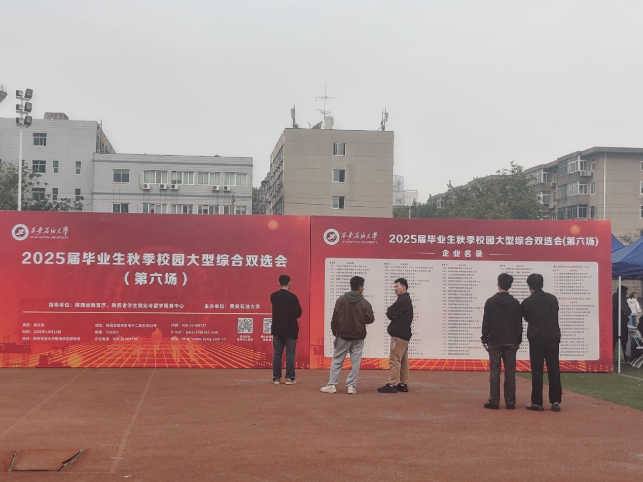 丹楓迎秋,金風(fēng)送爽。10月25日上午,我校在雁塔校區(qū)田徑場(chǎng)舉辦最后一場(chǎng)2025屆畢業(yè)生秋季校園招聘綜合雙選會(huì)。來(lái)自全國(guó)中石化中原石油工程設(shè)計(jì)有限公司、中國(guó)石油天然氣第六建設(shè)有限公司、新疆生產(chǎn)建設(shè)兵團(tuán)石油有限公司、中煤陜西能源化工集團(tuán)有限公司、陜西建工鐵建工程有限公司、陜西地礦物化探隊(duì)有限公司、西安秦華燃?xì)饧瘓F(tuán)有限公司、齊魯理工學(xué)院、堯柏特種水泥集團(tuán)有限公司,淄博市人社局組團(tuán)、渭南市人社局組團(tuán)的省內(nèi)外共計(jì)150余家企事業(yè)單位進(jìn)校招聘,行業(yè)領(lǐng)域覆蓋我校所有專(zhuān)業(yè)設(shè)置。來(lái)自我校及兄弟院校的3800余名本科生、研究生參加應(yīng)聘。