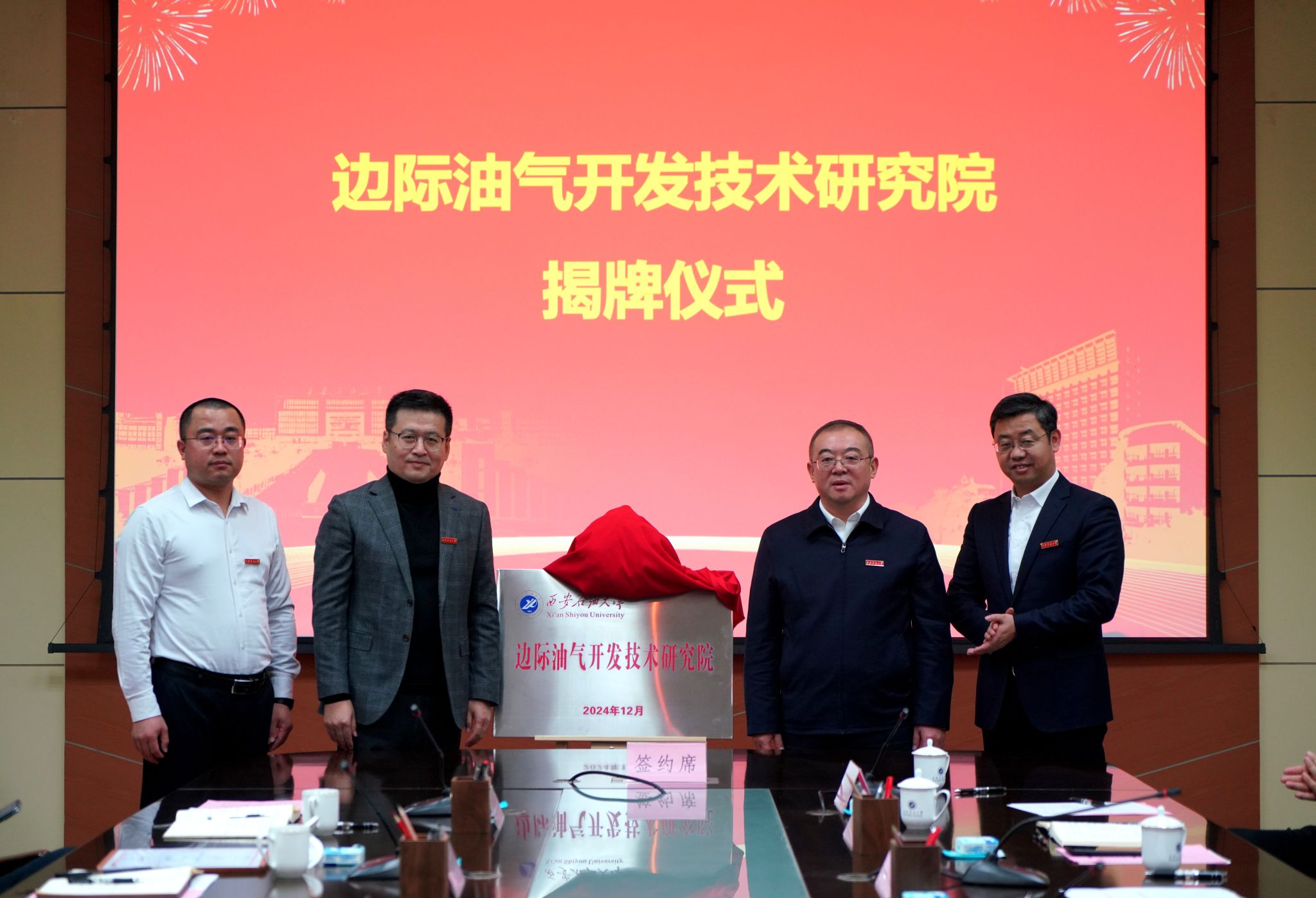 學(xué)校黨委書記常江、校長王進富、石油工程學(xué)院院長黃海、邊際油氣開發(fā)技術(shù)研究院崔仕章共同為邊際油氣開發(fā)技術(shù)研究院揭牌。