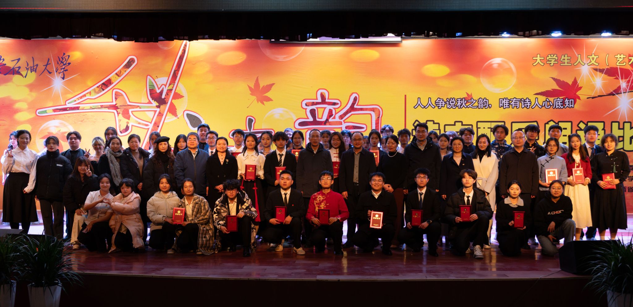12月12日晚,由校團(tuán)委、人文學(xué)院、教務(wù)處和教師工作部主辦,人文學(xué)院中文系、校學(xué)生會承辦,陜西省中華經(jīng)典誦寫講西安石油大學(xué)基地協(xié)辦的第十七屆“秋之韻”詩文配樂朗誦比賽(決賽)在鄠邑校區(qū)騰輝大學(xué)生活動中心舉辦。副校長張君濤、副校長趙健出席本次活動,相關(guān)職能處室和院(系)負(fù)責(zé)人及300余名學(xué)生觀看了比賽。