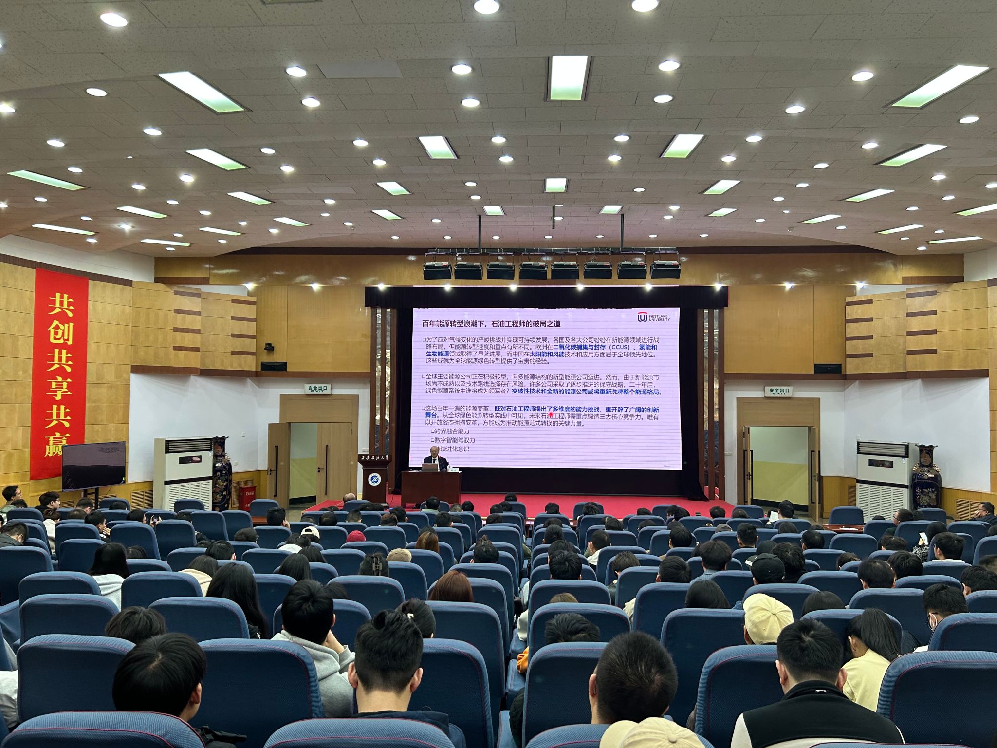 來訪期間,楊濤院士為學(xué)校師生作了題為《能源數(shù)字化和CCUS工業(yè)擴(kuò)展》的學(xué)術(shù)報(bào)告,詳細(xì)介紹了自動(dòng)化鉆井、智能油田管理和遠(yuǎn)程操作、二氧化碳捕集與封存等能源行業(yè)前沿技術(shù),指出數(shù)字技術(shù)已成為推動(dòng)能源行業(yè)綠色發(fā)展的核心動(dòng)力,石油高校要主動(dòng)應(yīng)變、積極求變,著力培養(yǎng)具有跨界融合能力、數(shù)字智能駕馭力、持續(xù)進(jìn)化能力的高層次人才,推動(dòng)能源行業(yè)實(shí)現(xiàn)綠色低碳和高質(zhì)量發(fā)展。報(bào)告會(huì)上,楊濤院士與師生進(jìn)行了深入交流和研討。