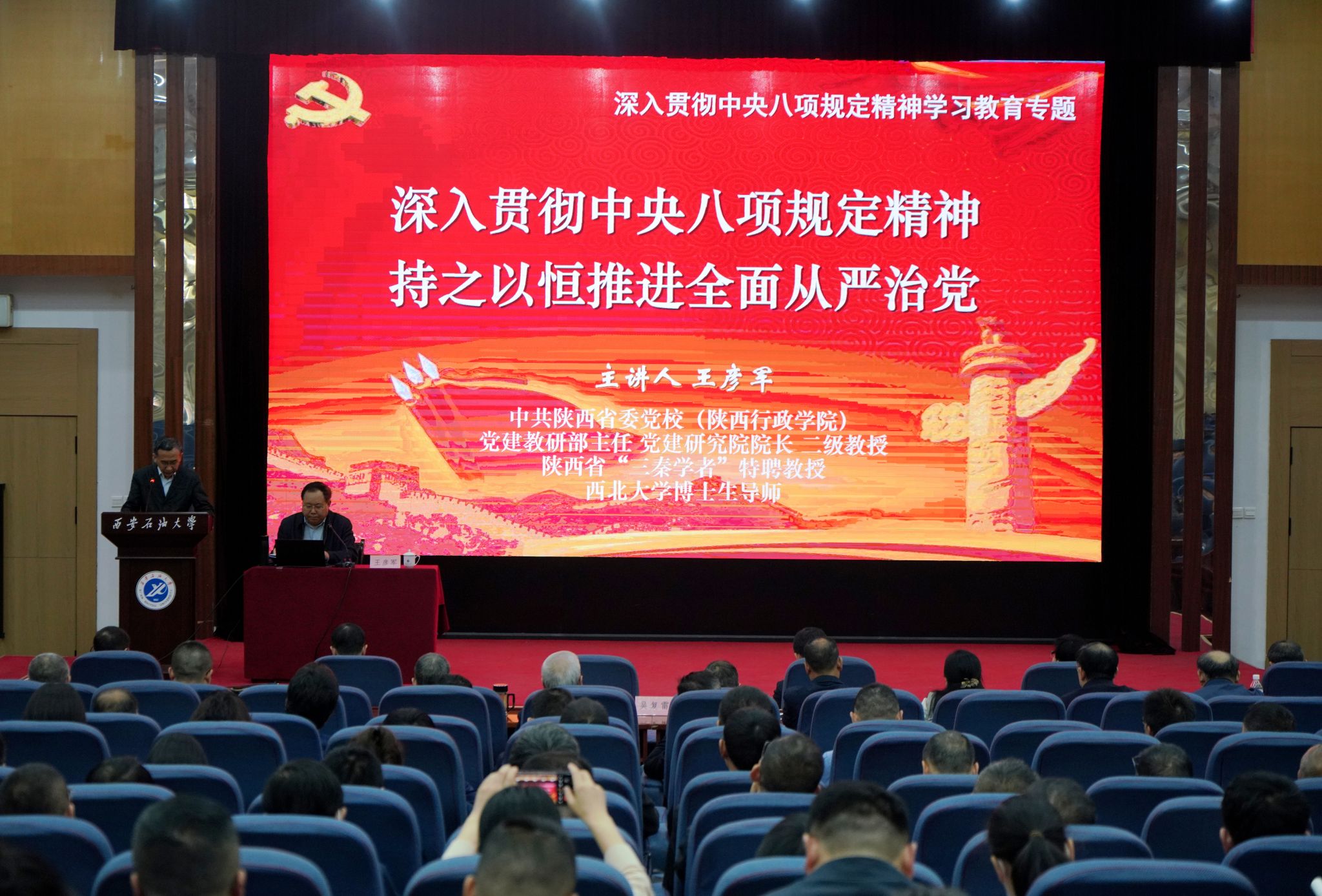 會(huì)上,王彥軍教授以《深入貫徹中央八項(xiàng)規(guī)定精神持之以恒推進(jìn)全面從嚴(yán)治黨》為題,深入剖析了深入貫徹中央八項(xiàng)規(guī)定精神學(xué)習(xí)教育的時(shí)代背景,闡明了黨的十八大以來以習(xí)近平同志為核心的黨中央圍繞保持黨同人民群眾的血肉聯(lián)系,鍥而不舍落實(shí)中央八項(xiàng)規(guī)定強(qiáng)化紀(jì)律約束的重要性和迫切性。從厲行勤儉節(jié)約、反對奢侈浪費(fèi)和奢靡之風(fēng)、廉潔從政以及工作作風(fēng)務(wù)實(shí)等方面全面論述了中央八項(xiàng)規(guī)定及其精神的主要內(nèi)容,細(xì)致梳理了習(xí)近平總書記關(guān)于作風(fēng)建設(shè)的重要論述,結(jié)合深入淺出的實(shí)例深刻解析了新時(shí)代黨的作風(fēng)建設(shè)“為什么抓”“抓什么”“怎么抓”的根本方向性問題,進(jìn)一步廓清了學(xué)習(xí)教育推動(dòng)管黨治黨走深走實(shí)的重要意義。