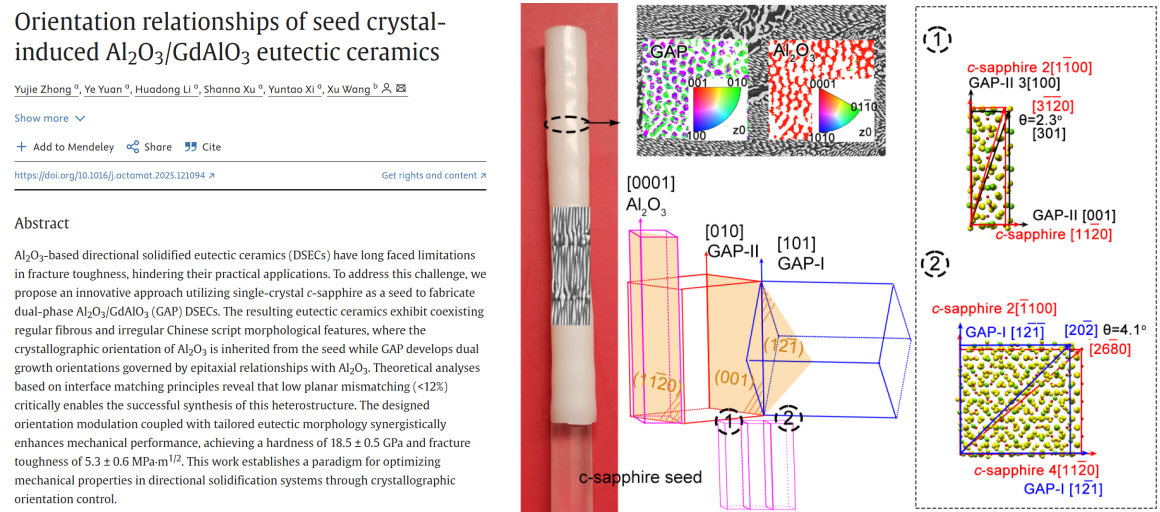 近日,我校材料科學(xué)與工程學(xué)院鐘玉潔科研團隊再次以西安石油大學(xué)為第一單位,在材料頂級期刊《Acta Materialia》(中科院一區(qū)TOP期刊,五年影響因子9.3)上發(fā)表研究論文《Orientation relationships of seed crystal-induced Al2O3/GdAlO3 eutectic ceramics》。