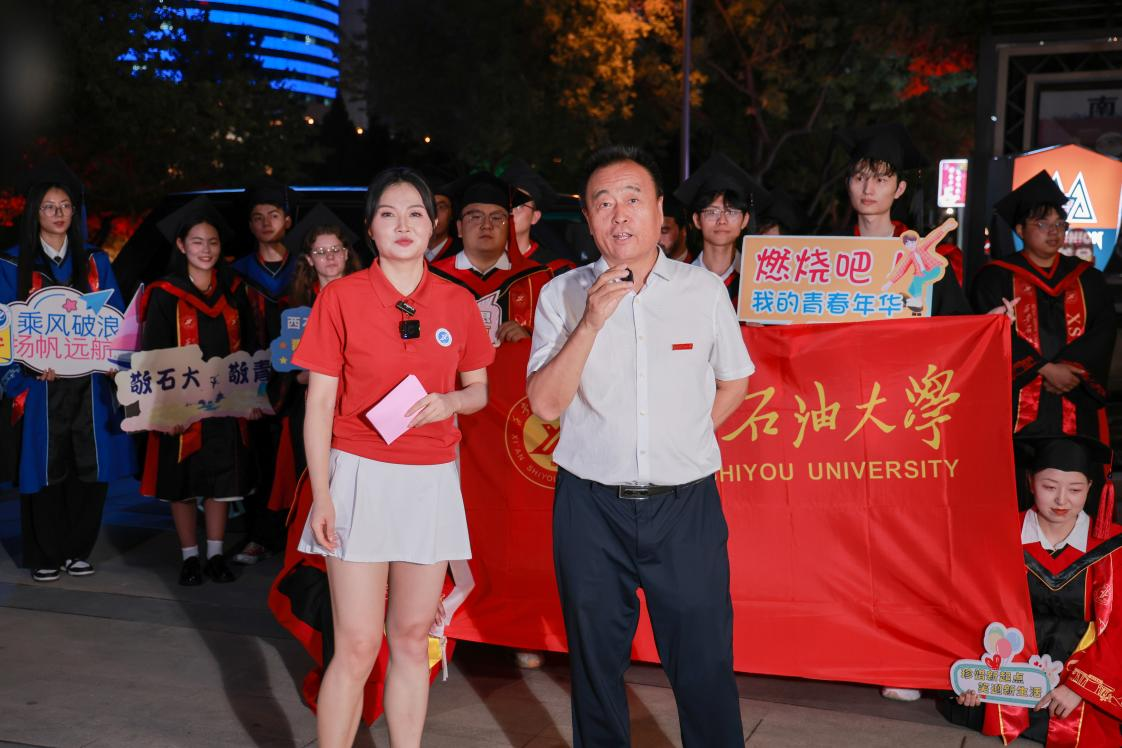 當(dāng)直播間傳來“傳承鐵人精神,堅(jiān)定能源報(bào)國理想”的激昂口號(hào),瞬間點(diǎn)燃鄠邑校區(qū)畢業(yè)生宿舍樓下的熱烈氛圍。當(dāng)“祝西石大2025屆畢業(yè)生前程似錦”的祝福在夜色中閃耀,母校的牽掛化作熠熠星光,傳遞著最真摯的祝愿。點(diǎn)點(diǎn)燈火傳遞城市祝福,聲聲叮嚀承載母校深情。點(diǎn)亮活動(dòng)甫一結(jié)束,種宇宏在學(xué)工部負(fù)責(zé)人、各院系副書記及畢業(yè)班輔導(dǎo)員的陪同下,步履不停,深入畢業(yè)生宿舍,開展暖心走訪慰問,為即將揚(yáng)帆遠(yuǎn)航的學(xué)子送上關(guān)懷與祝福。