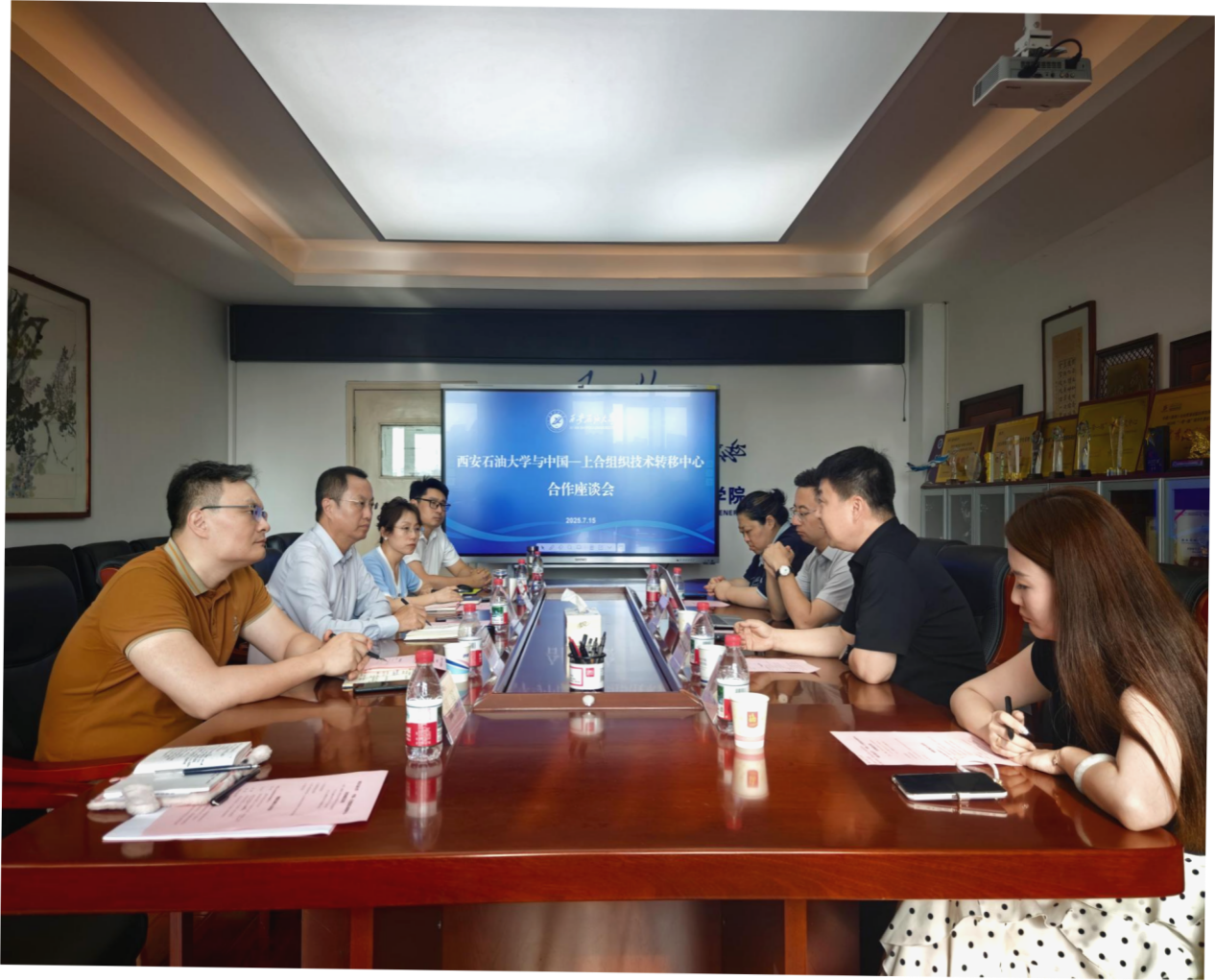 7月15日下午,中國—上合組織技術(shù)轉(zhuǎn)移中心(以下簡稱“技術(shù)轉(zhuǎn)移中心”)國際交流與合作辦主任羅一鳴,技術(shù)轉(zhuǎn)移中心西安協(xié)同中心(籌)負(fù)責(zé)人、西安曲江新區(qū)人才交流中心黨支部書記、常務(wù)副主任、中國國際人才市場西安市場副主任何小奇等一行4人來校交流座談,雙方合作座談會在雁塔校區(qū)東方石油樓801會議室舉行。校黨委委員、副校長張榮軍出席座談會。