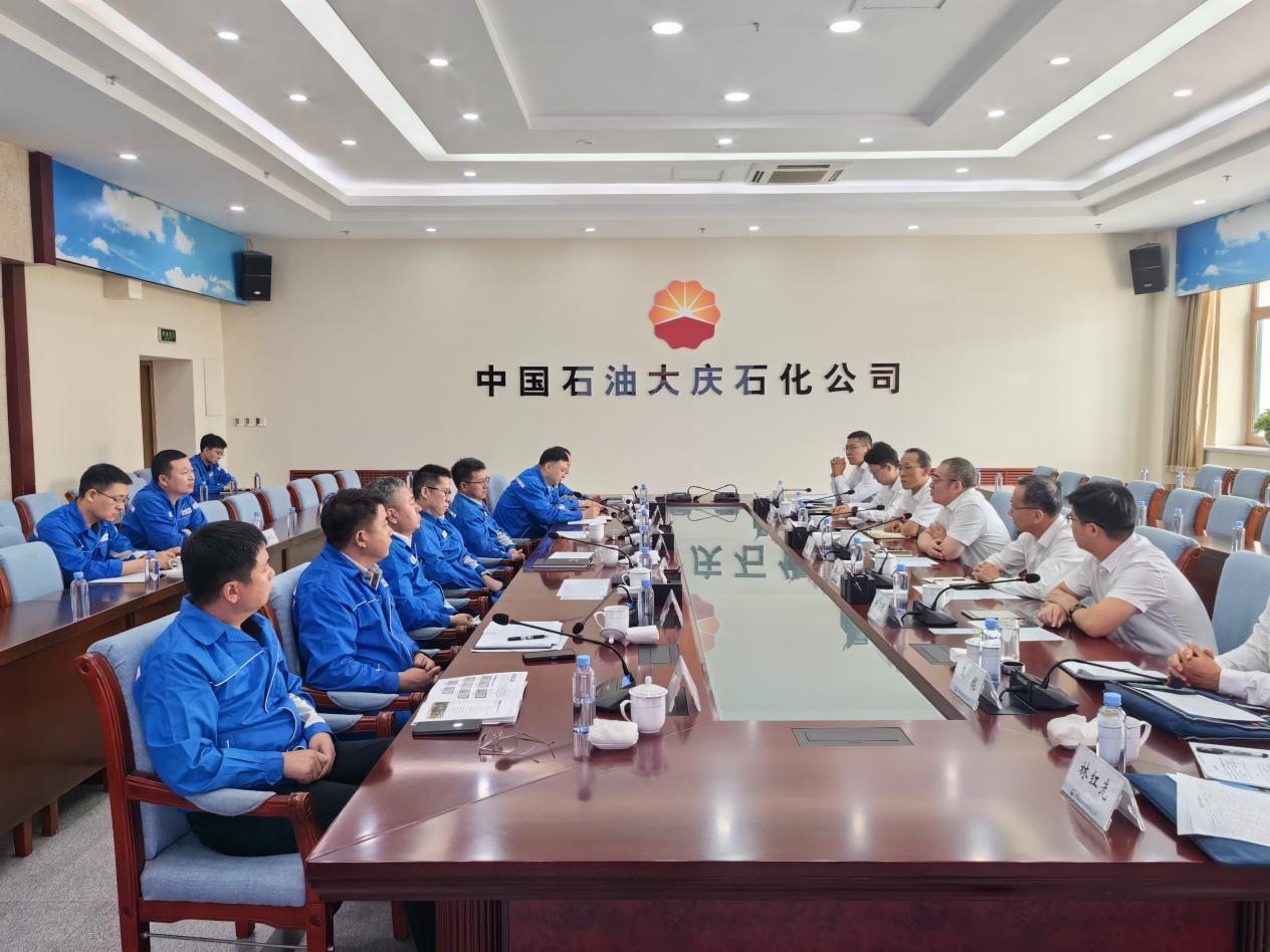 在中國石油大慶石化分公司,常江一行與公司執(zhí)行董事、黨委書記于強,副總經理、安全總監(jiān)崔俊峰,副總經濟師盛開等交流座談,介紹了上次到訪后學校在石油化工領域的科研進展,圍繞建立科研合作與人才交流長效機制、有效發(fā)揮學校智力支撐和企業(yè)場景優(yōu)勢等深入溝通交流。