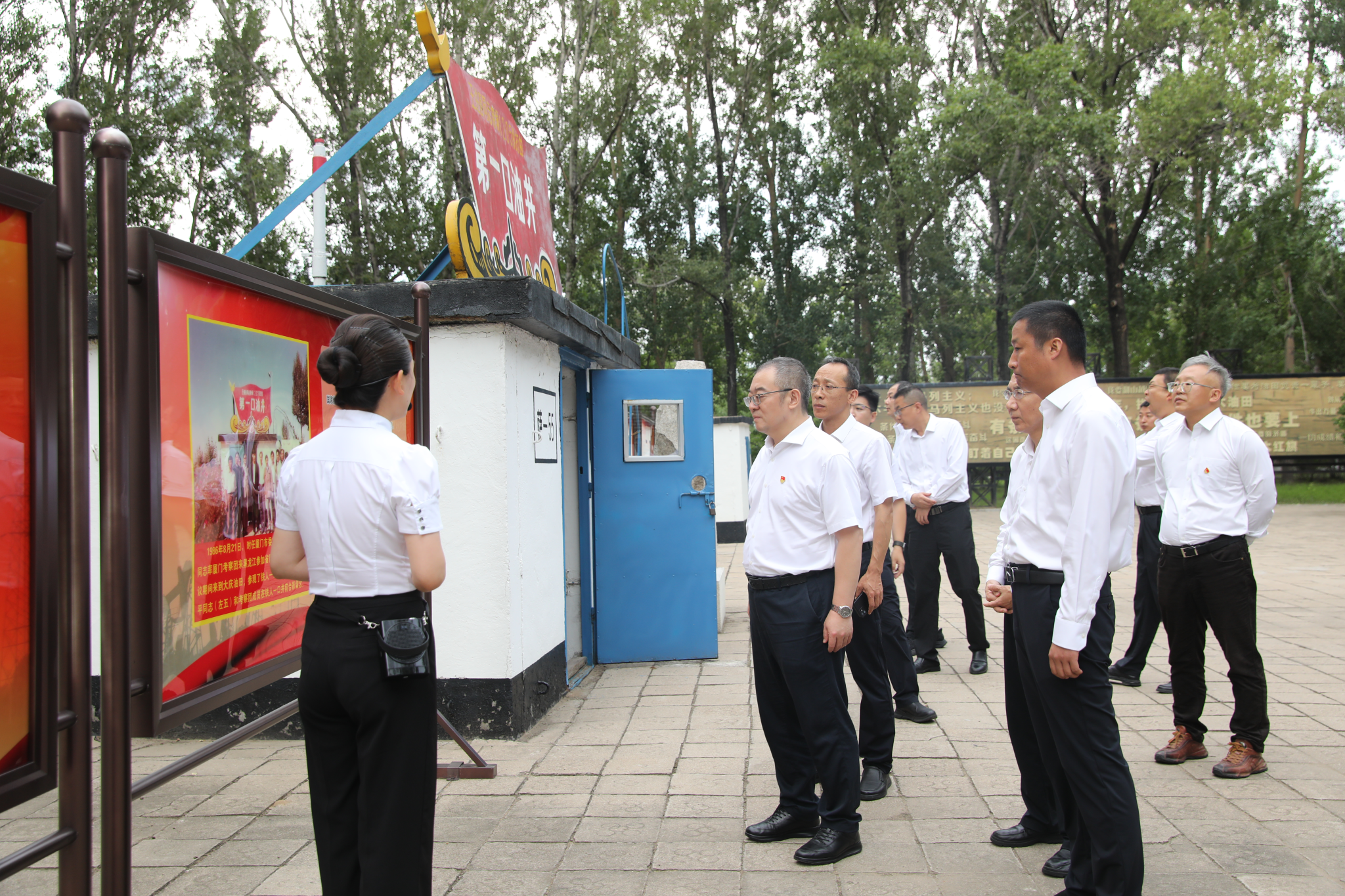 在大慶走訪期間,8月8日,時值1205鉆井隊被授予“鋼鐵鉆井隊”稱號67周年紀念日。常江一行特地前往大慶鉆探鉆井二公司“鋼鐵鉆井隊”1205鉆井隊作業(yè)現場,參觀了1205鉆井隊隊史展覽館,見證了石油工程學院黨委與大慶鉆探鉆井二公司黨委在當天舉辦的黨建共建簽約儀式,勉勵共建各方各級答好“牢記重大囑托”的政治答卷、“培養(yǎng)時代新人”的育人答卷、“建設一流”的發(fā)展答卷。隨后,常江一行前往鐵人一口井教育培訓基地現場參觀薩-55井這一鐵人精神最具象征意義的物證,實地重溫“有條件要上,沒有條件創(chuàng)造條件也要上”的豪邁誓言。
