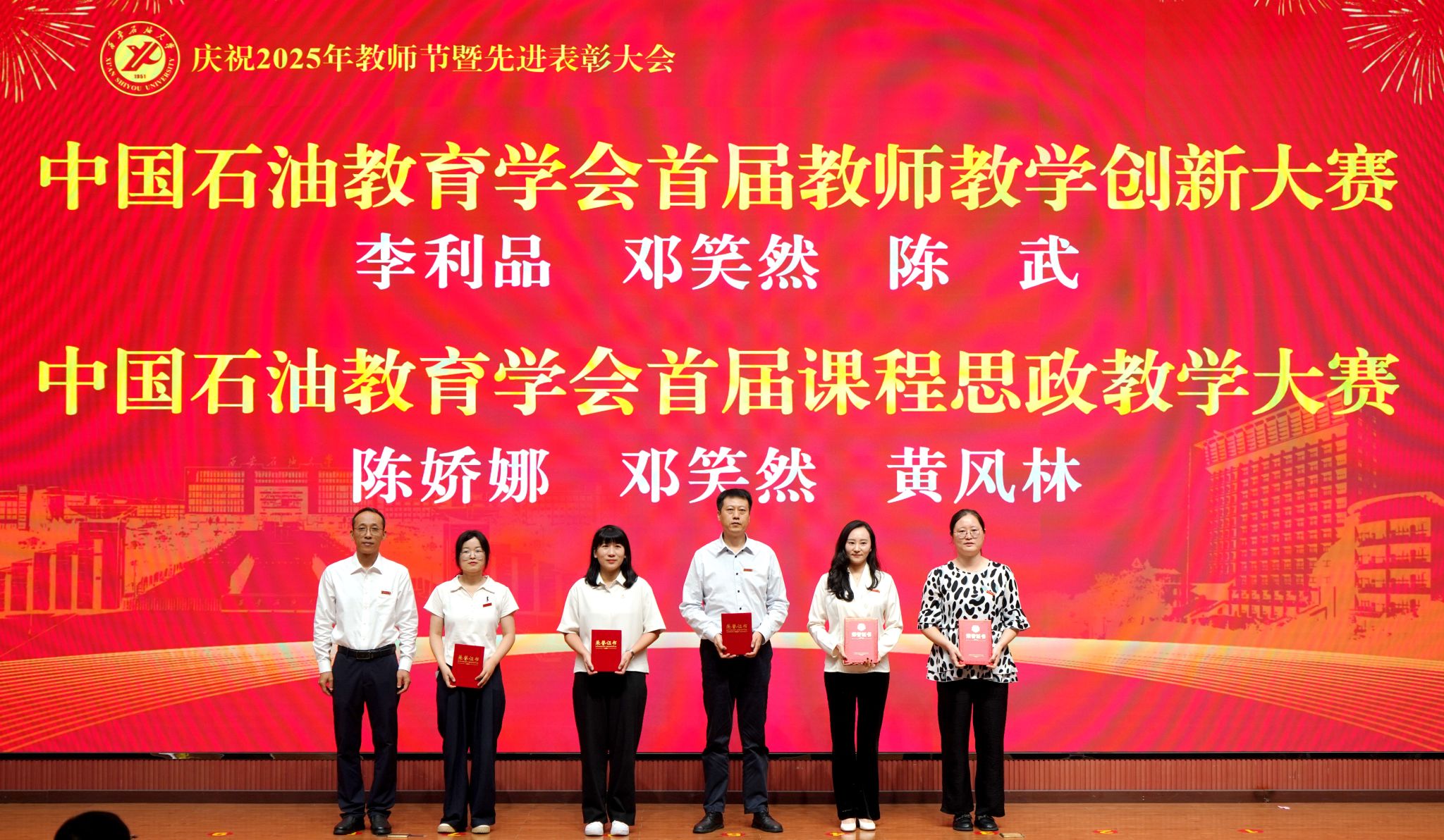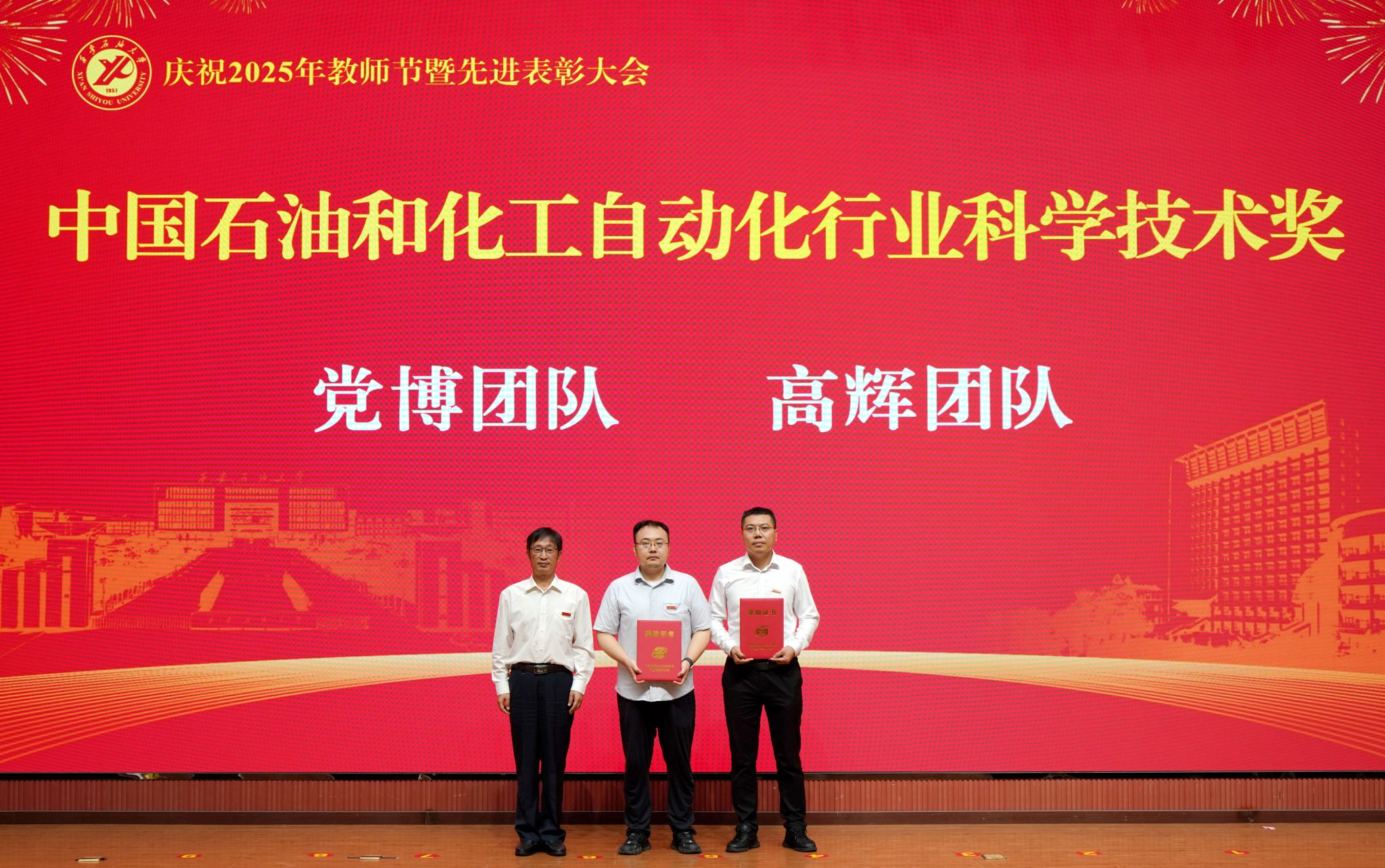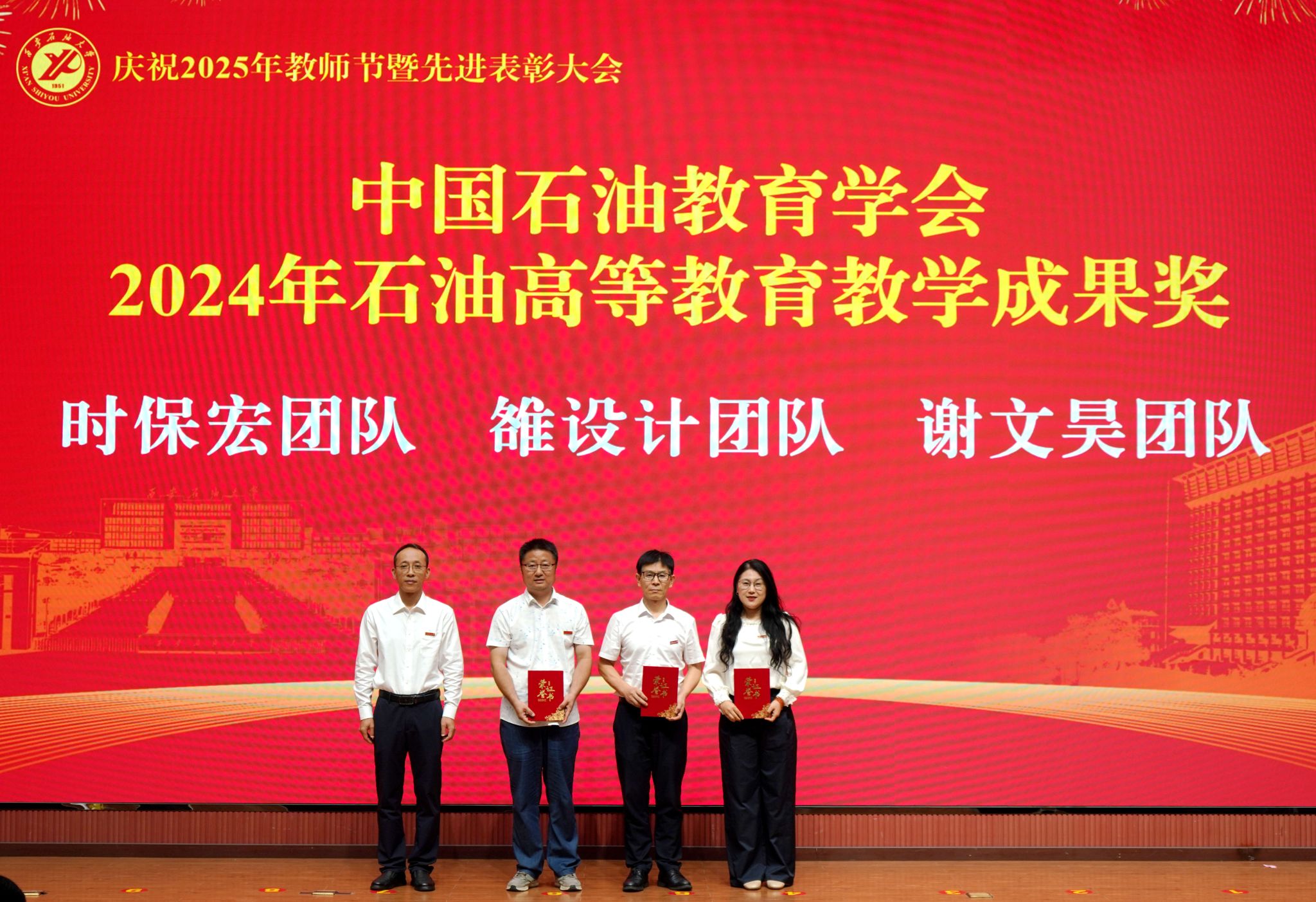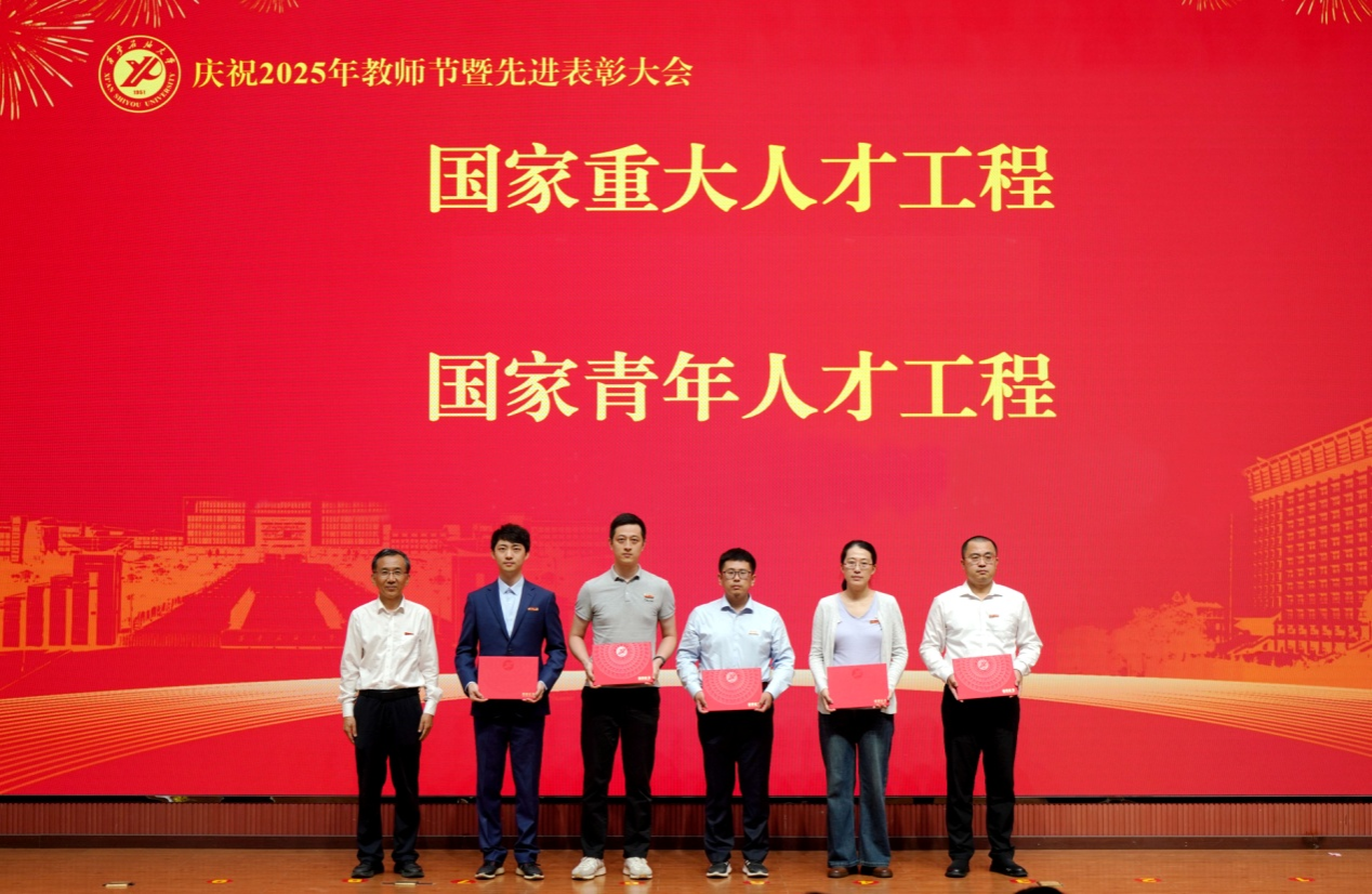 表彰大會在國歌聲中開始,校領(lǐng)導(dǎo)宣讀表彰決定,并為受表彰教師代表頒發(fā)證書和獎?wù)?。校黨委副書記張木宣讀2024年度陜西省科學(xué)技術(shù)進(jìn)步獎、國家重大人才工程和國家青年人才工程入選名單;校黨委副書記、紀(jì)委書記、監(jiān)察專員王輝強(qiáng)宣讀陜西省高層次人才特殊支持計劃等人選名單;副校長蘇文甫宣讀陜西高校優(yōu)秀青年人才支持計劃、陜西省“三秦博創(chuàng)”人才支持項目、中國石油和化工自動化行業(yè)科學(xué)技術(shù)獎獲獎名單;副校長張榮軍宣讀2025年陜西省科技計劃項目(第三批、第四批)、陜西省2023年高等教育教學(xué)成果獎和陜西省第十三屆基礎(chǔ)教育教學(xué)成果獎獲獎名單;副校長張君濤宣讀陜西省課程思政精品課程,中國石油教育學(xué)會2024年石油高等教育教學(xué)成果獎、首屆教師教學(xué)創(chuàng)新大賽、首屆課程思政教學(xué)大賽獲獎名單;副校長張驍勇宣讀《中共西安石油大學(xué)委員會關(guān)于表彰2025年師德先進(jìn)集體和先進(jìn)個人的決定》;副校長趙健宣讀《西安石油大學(xué)關(guān)于表彰獎勵“教書育人30年”教師的決定》《中共西安石油大學(xué)委員會 西安石油大學(xué)關(guān)于表彰2025年優(yōu)秀教師、先進(jìn)教育工作者的決定》;副校長種宇宏宣讀第21屆陜西青年五四獎?wù)潞偷诙萌珖髮W(xué)生職業(yè)規(guī)劃大賽陜西省決賽獲獎名單,全體與會校領(lǐng)導(dǎo)為受表彰教師代表頒發(fā)證書和獎?wù)隆?/p>