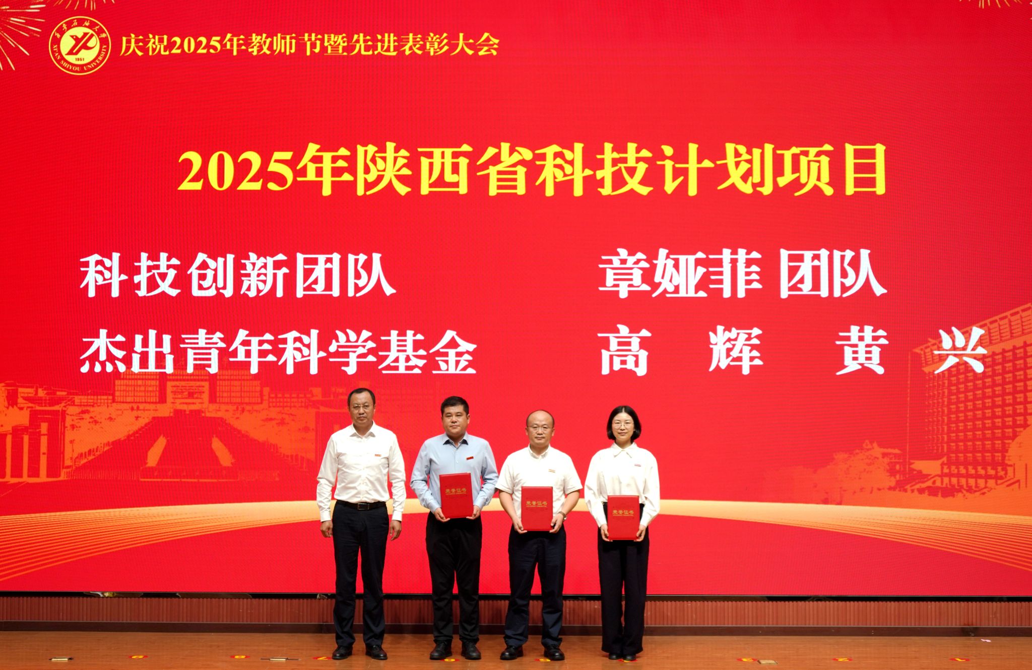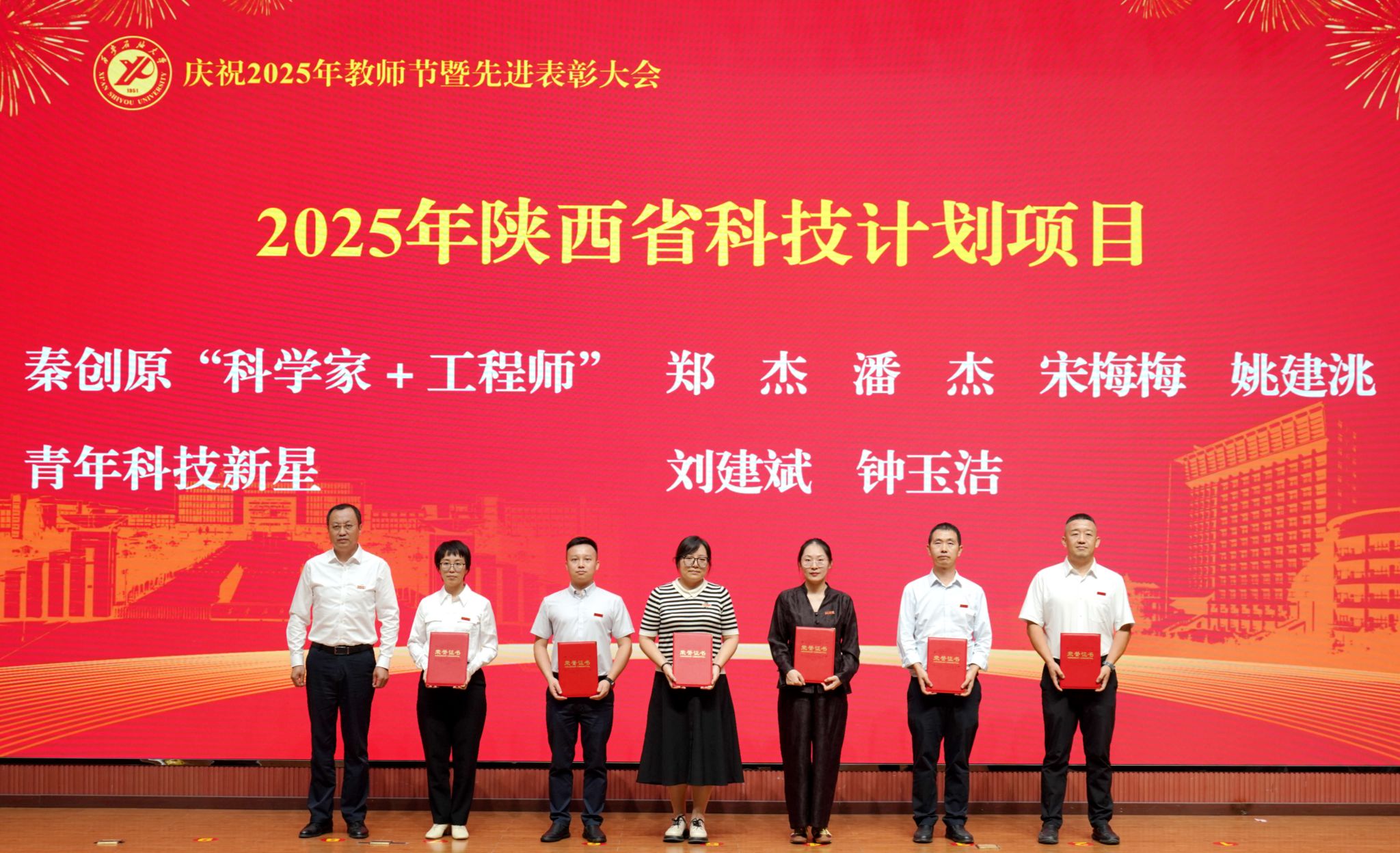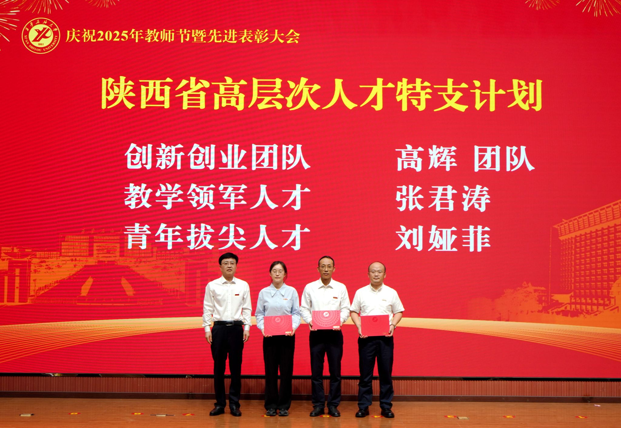 表彰大會在國歌聲中開始,校領(lǐng)導(dǎo)宣讀表彰決定,并為受表彰教師代表頒發(fā)證書和獎?wù)?。校黨委副書記張木宣讀2024年度陜西省科學(xué)技術(shù)進(jìn)步獎、國家重大人才工程和國家青年人才工程入選名單;校黨委副書記、紀(jì)委書記、監(jiān)察專員王輝強(qiáng)宣讀陜西省高層次人才特殊支持計劃等人選名單;副校長蘇文甫宣讀陜西高校優(yōu)秀青年人才支持計劃、陜西省“三秦博創(chuàng)”人才支持項目、中國石油和化工自動化行業(yè)科學(xué)技術(shù)獎獲獎名單;副校長張榮軍宣讀2025年陜西省科技計劃項目(第三批、第四批)、陜西省2023年高等教育教學(xué)成果獎和陜西省第十三屆基礎(chǔ)教育教學(xué)成果獎獲獎名單;副校長張君濤宣讀陜西省課程思政精品課程,中國石油教育學(xué)會2024年石油高等教育教學(xué)成果獎、首屆教師教學(xué)創(chuàng)新大賽、首屆課程思政教學(xué)大賽獲獎名單;副校長張驍勇宣讀《中共西安石油大學(xué)委員會關(guān)于表彰2025年師德先進(jìn)集體和先進(jìn)個人的決定》;副校長趙健宣讀《西安石油大學(xué)關(guān)于表彰獎勵“教書育人30年”教師的決定》《中共西安石油大學(xué)委員會 西安石油大學(xué)關(guān)于表彰2025年優(yōu)秀教師、先進(jìn)教育工作者的決定》;副校長種宇宏宣讀第21屆陜西青年五四獎?wù)潞偷诙萌珖髮W(xué)生職業(yè)規(guī)劃大賽陜西省決賽獲獎名單,全體與會校領(lǐng)導(dǎo)為受表彰教師代表頒發(fā)證書和獎?wù)隆?/p>