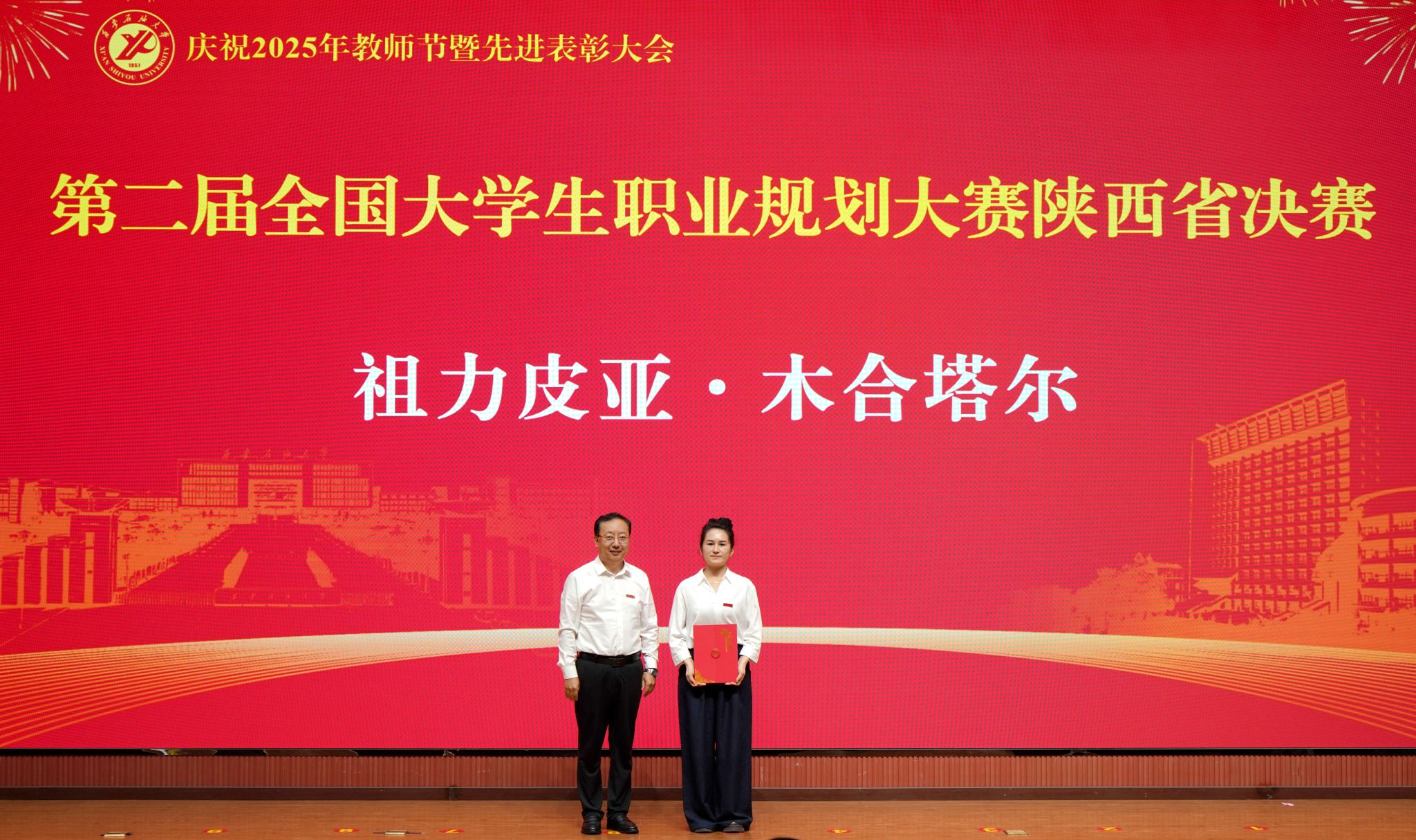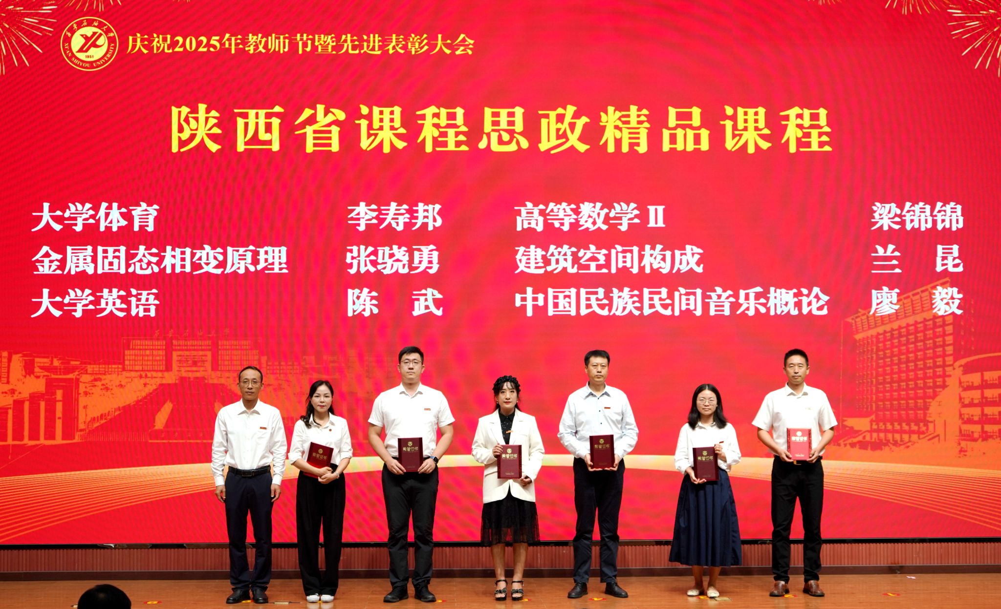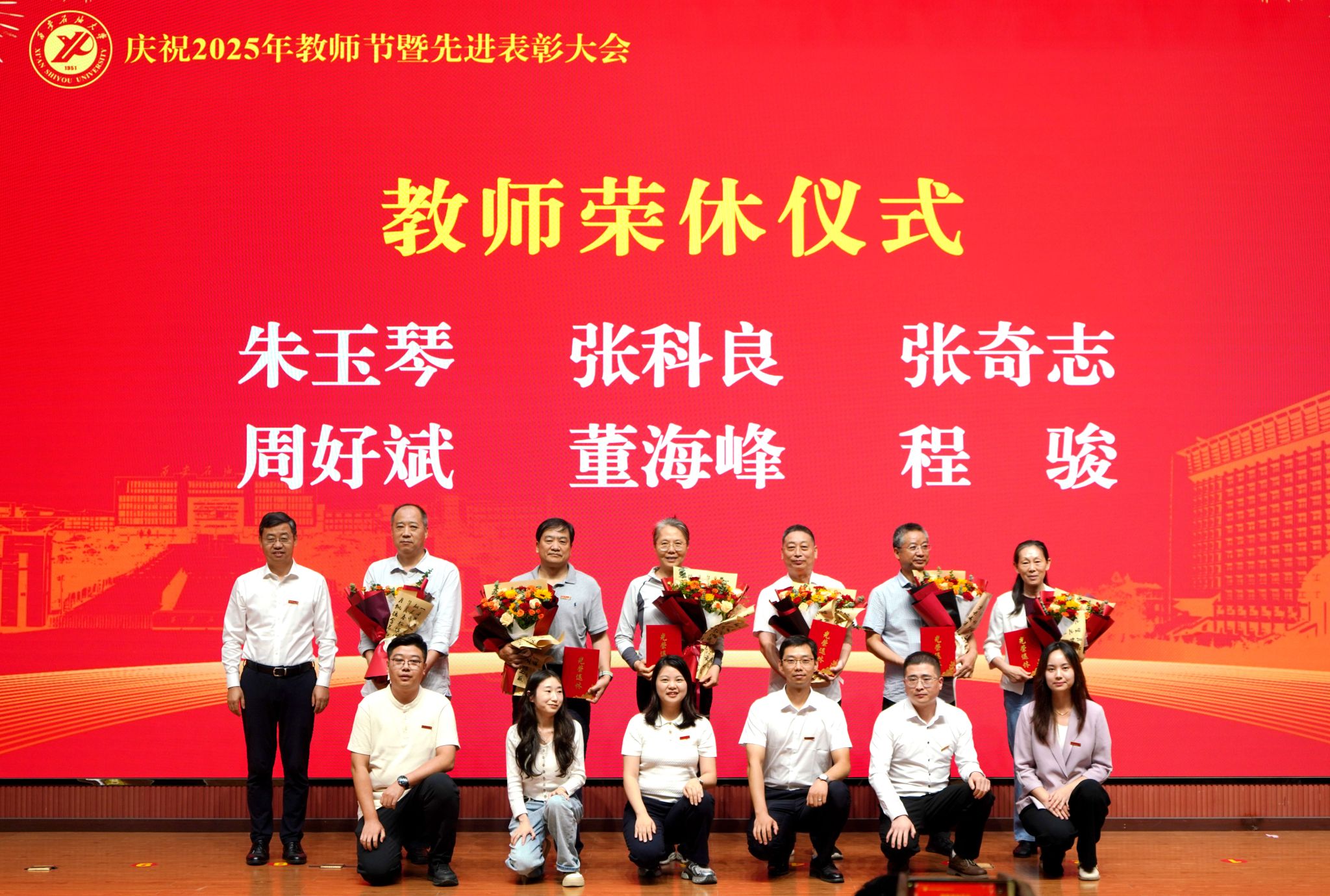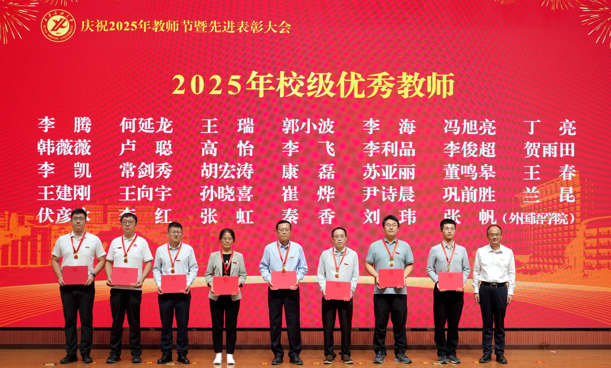 表彰大會在國歌聲中開始,校領(lǐng)導(dǎo)宣讀表彰決定,并為受表彰教師代表頒發(fā)證書和獎?wù)?。校黨委副書記張木宣讀2024年度陜西省科學(xué)技術(shù)進(jìn)步獎、國家重大人才工程和國家青年人才工程入選名單;校黨委副書記、紀(jì)委書記、監(jiān)察專員王輝強(qiáng)宣讀陜西省高層次人才特殊支持計劃等人選名單;副校長蘇文甫宣讀陜西高校優(yōu)秀青年人才支持計劃、陜西省“三秦博創(chuàng)”人才支持項目、中國石油和化工自動化行業(yè)科學(xué)技術(shù)獎獲獎名單;副校長張榮軍宣讀2025年陜西省科技計劃項目(第三批、第四批)、陜西省2023年高等教育教學(xué)成果獎和陜西省第十三屆基礎(chǔ)教育教學(xué)成果獎獲獎名單;副校長張君濤宣讀陜西省課程思政精品課程,中國石油教育學(xué)會2024年石油高等教育教學(xué)成果獎、首屆教師教學(xué)創(chuàng)新大賽、首屆課程思政教學(xué)大賽獲獎名單;副校長張驍勇宣讀《中共西安石油大學(xué)委員會關(guān)于表彰2025年師德先進(jìn)集體和先進(jìn)個人的決定》;副校長趙健宣讀《西安石油大學(xué)關(guān)于表彰獎勵“教書育人30年”教師的決定》《中共西安石油大學(xué)委員會 西安石油大學(xué)關(guān)于表彰2025年優(yōu)秀教師、先進(jìn)教育工作者的決定》;副校長種宇宏宣讀第21屆陜西青年五四獎?wù)潞偷诙萌珖髮W(xué)生職業(yè)規(guī)劃大賽陜西省決賽獲獎名單,全體與會校領(lǐng)導(dǎo)為受表彰教師代表頒發(fā)證書和獎?wù)隆?/p>