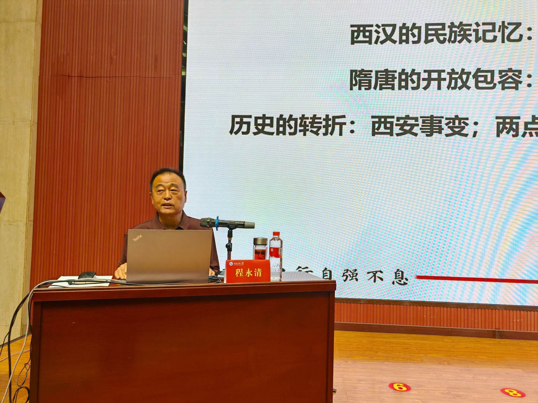 程永清圍繞“紅色血脈:學校成立的宏大歷史背景”“自強不息:艱難曲折的辦學歷程”“堅定前行:文化價值和精神追求”三個方面,以豐富的史料和生動的案例帶領新生深入學習。他從我國石油工業(yè)發(fā)展歷程與習仲勛等老一輩革命家對石油開發(fā)的重大貢獻講起,闡述學校成立的歷史背景,回顧學校的建校歷史,解讀學校的辦學精神,展示學校的辦學成就。報告中穿插播放《孫鴻烈院士談父親》《第一屆畢業(yè)生武華》等珍貴視頻,以親歷者的講述直觀感受辦學的艱辛歷程。講述至動情處,程永清以一句“羌笛何須怨楊柳”與臺下學生互動,同學們齊聲應答“春風不度玉門關”。這首千年古詩的應和,不僅瞬間拉近了師生距離,更生動詮釋了學校扎根西北、為國育才的堅守與奉獻,現(xiàn)場氣氛熱烈,掌聲雷動。在梳理學校辦學歷程時,他指出,學校誕生于新中國石油工業(yè)急需人才的關鍵時期,是新中國最早培養(yǎng)石油工業(yè)技術干部的學校之一。這一歷程始終與國家戰(zhàn)略緊密相連,承載著打破“中國貧油論”,助力國家能源安全的使命。學校在不同歷史階段始終堅守“為國家石油工業(yè)培養(yǎng)人才”的初心,即使在1980年復辦時,也服從全國石油專業(yè)整體布局,優(yōu)先恢復機械、儀器和經(jīng)管專業(yè),展現(xiàn)出無私奉獻的大局意識。在談及學校文化價值時,他強調(diào),學校始終扎根西北熱土,背依中華民族祖脈秦嶺,面臨滋養(yǎng)中華文明的渭水,從西周禮樂文化中汲取養(yǎng)分,更在長期辦學中形成了以“石油紅”為象征的特色文化符號。一代代西石大人秉持校風和校訓,涌現(xiàn)出顧心怡、馮家潮、夏述明等優(yōu)秀校友,他們的科研成果與奮斗故事,正是學校精神的生動體現(xiàn)。