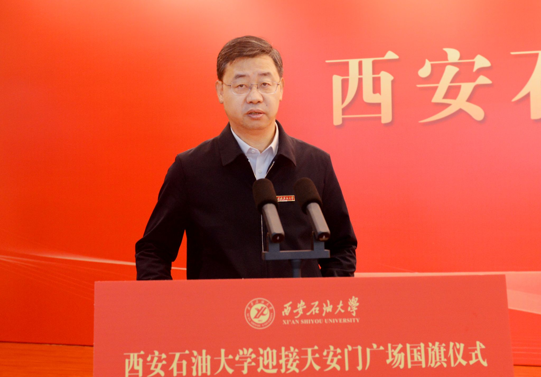 校長王進富發(fā)表致辭,他總結回顧了學校74年來與黨和國家同向同行、為祖國能源事業(yè)不懈奮斗的辦學歷程,強調學校始終“以‘石’為基、以‘油’鑄魂”, 在服務國家能源戰(zhàn)略中彰顯使命擔當,培養(yǎng)了一批又一批能源領域的棟梁之才。他向全體師生提出三點希望:一是希望全體師生高擎信仰之炬,把弘揚愛國主義精神作為永恒主題。要持續(xù)發(fā)揮好這面國旗的愛國主義教育功能,開展內(nèi)容豐富、形式多樣的愛國主義教育活動,營造愛黨愛國、愛校榮校的濃厚氛圍;二是希望全體師生堅定強國信念,把踐行奮斗實干擔當作為精神底色。要堅持石油精神辦學、鐵人精神育人、延安精神鑄魂,秉承“愛國奉獻、艱苦奮斗、科學求實、開拓進取”的辦學精神,全面落實立德樹人根本任務,不斷提升服務國家能源戰(zhàn)略與區(qū)域發(fā)展的能力,在教育強國建設中展現(xiàn)更大作為;三是希望全體師生挺膺擔當之志,把矢志能源報國使命作為畢生追求。廣大教師要弘揚教育家精神,以赤誠之心、奉獻之心、仁愛之心教書育人,做學生成長的引路人,廣大學子要秉承“好學力行、自強不息”的校訓,傳承鐵人精神,將使命扛在肩頭,為國家能源事業(yè)貢獻青春力量。