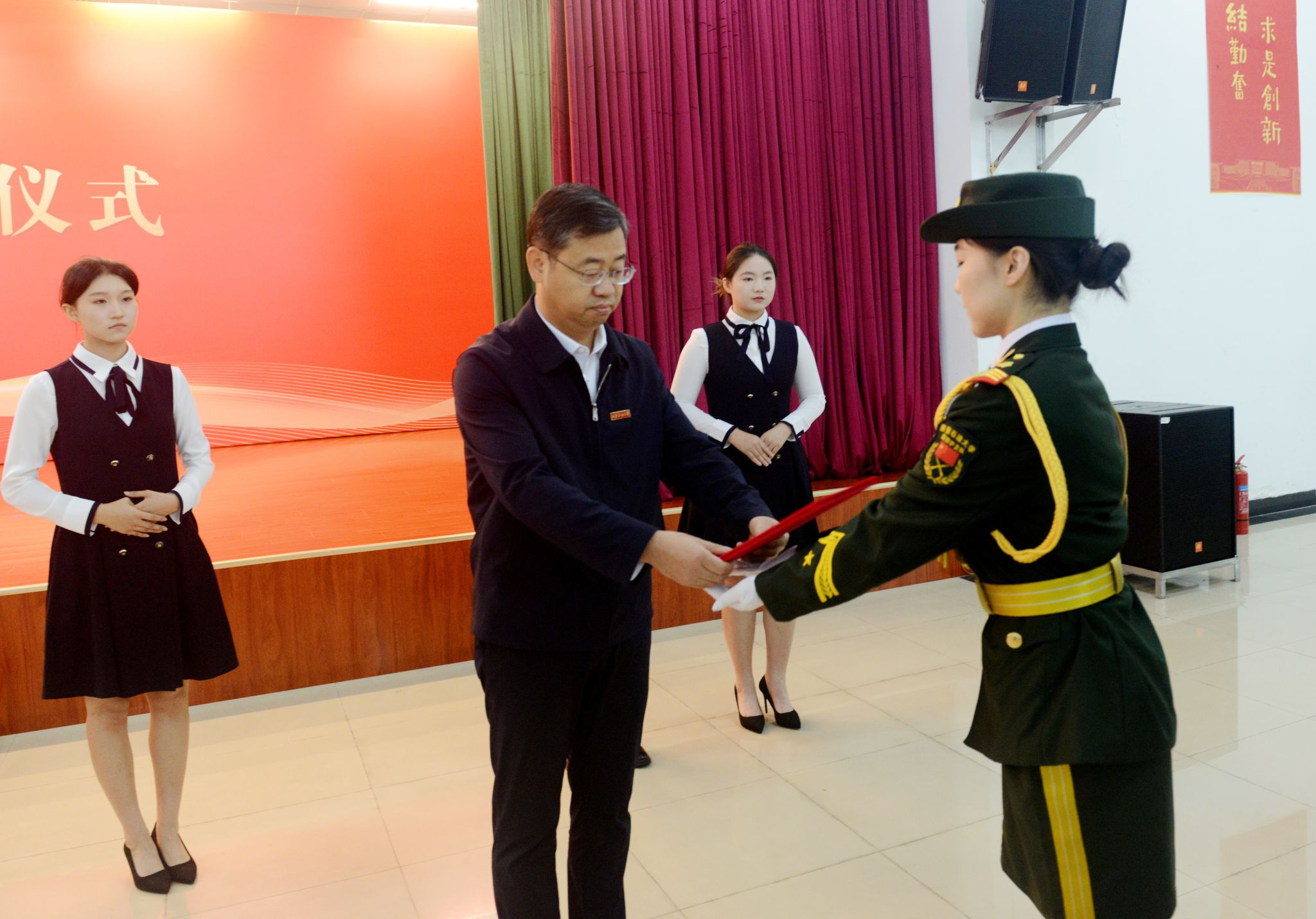 上午8時,儀式在莊嚴的氛圍中正式開始。校長王進富將獲贈的國旗及證書鄭重交予學校國旗護衛(wèi)隊,國旗護衛(wèi)隊隊員神情肅穆,步伐鏗鏘,莊嚴地護送國旗入場。這面國旗旗長5米、寬3.3米,為超大國旗,整幅旗面無拼接,五顆星由織造人員手工縫制,工藝特殊,承載著億萬中華兒女的深厚愛國情懷,也凝聚著我校建校70周年的特別紀念。
