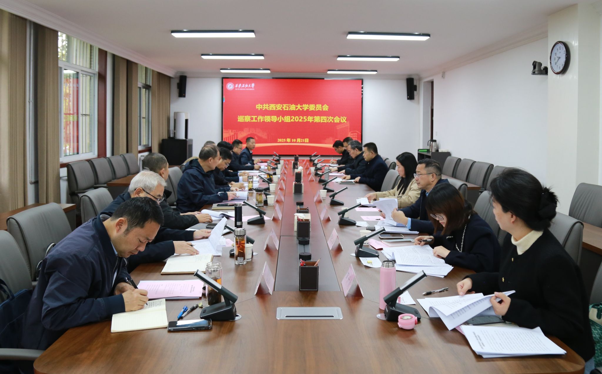 10月21日上午,學校黨委巡察工作領導小組2025年第四次會議在鄠邑校區(qū)第三會議室召開,聽取第三屆黨委第一輪巡察整改工作總體情況匯報和四個被巡察院(系)黨組織整改落實情況匯報。校黨委副書記、校長王進富出席會議并講話。校黨委副書記、紀委書記、監(jiān)察專員,校黨委巡察工作領導小組副組長王輝強主持會議。黨委辦公室、紀檢監(jiān)察機構、黨委巡察工作辦公室、黨委組織部、黨委宣傳部、黨委統(tǒng)戰(zhàn)部、黨委學生工作部、黨委教師工作部、黨委保衛(wèi)部、研究生工作部、審計處主要負責人和第一輪巡察四個被巡察院(系)黨委(黨總支)書記參加會議。