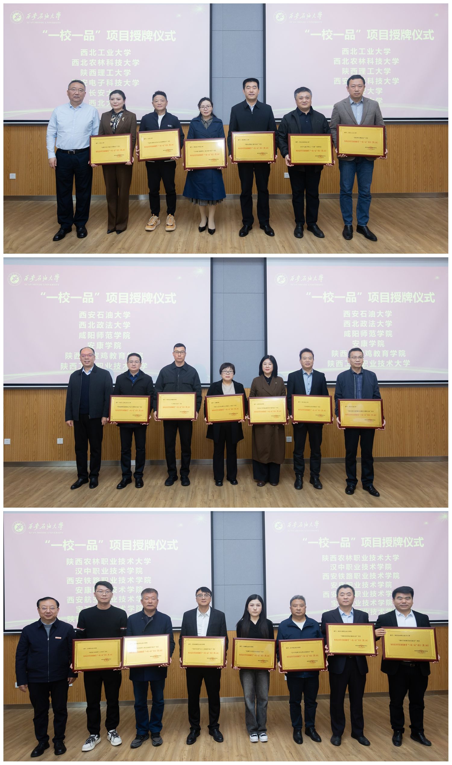 在非學(xué)歷繼續(xù)教育“一校一品”項目授牌儀式上,葉培哲宣讀了陜西省高等繼續(xù)教育學(xué)會《關(guān)于公布陜西省非學(xué)歷繼續(xù)教育“一校一品”項目(第二批)評選結(jié)果的通知》,包括我校非學(xué)歷繼續(xù)教育項目“園區(qū)發(fā)展與高質(zhì)量項目建設(shè)專題研討班”在內(nèi)的19所高校的非學(xué)歷教育特色項目入選,龍治剛、葉培哲和種宇宏分別為19所高校代表頒發(fā)牌匾。