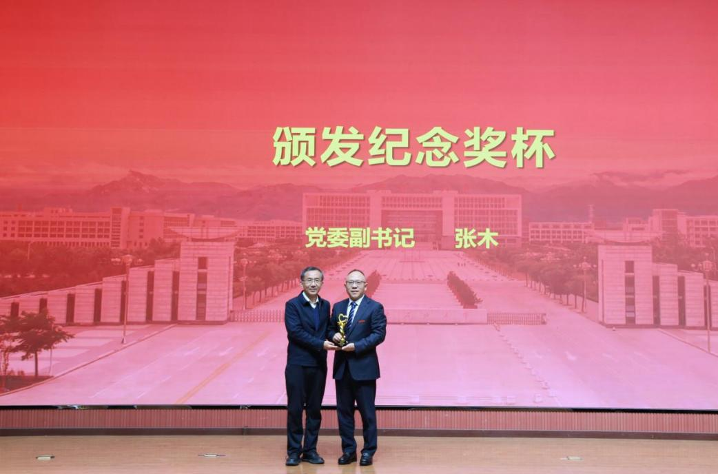 張木滿懷深情地宣讀《騰輝助學金廿周年慶典紀念冊》親筆序言,追憶1988年與何榮校友相識的點滴,激動與感恩之情溢于言表,他深情地贊嘆何榮校友求學時的奮進拼搏,與事業(yè)維艱之時仍堅持回饋母校的赤子情懷。隨后,張木為何榮校友頒發(fā)“廿年初心?資助育人功勛獎”紀念獎杯,那沉甸甸的獎杯滿載著全校師生對他二十年堅守育人初心的崇高敬意,現(xiàn)場掌聲經(jīng)久不息。