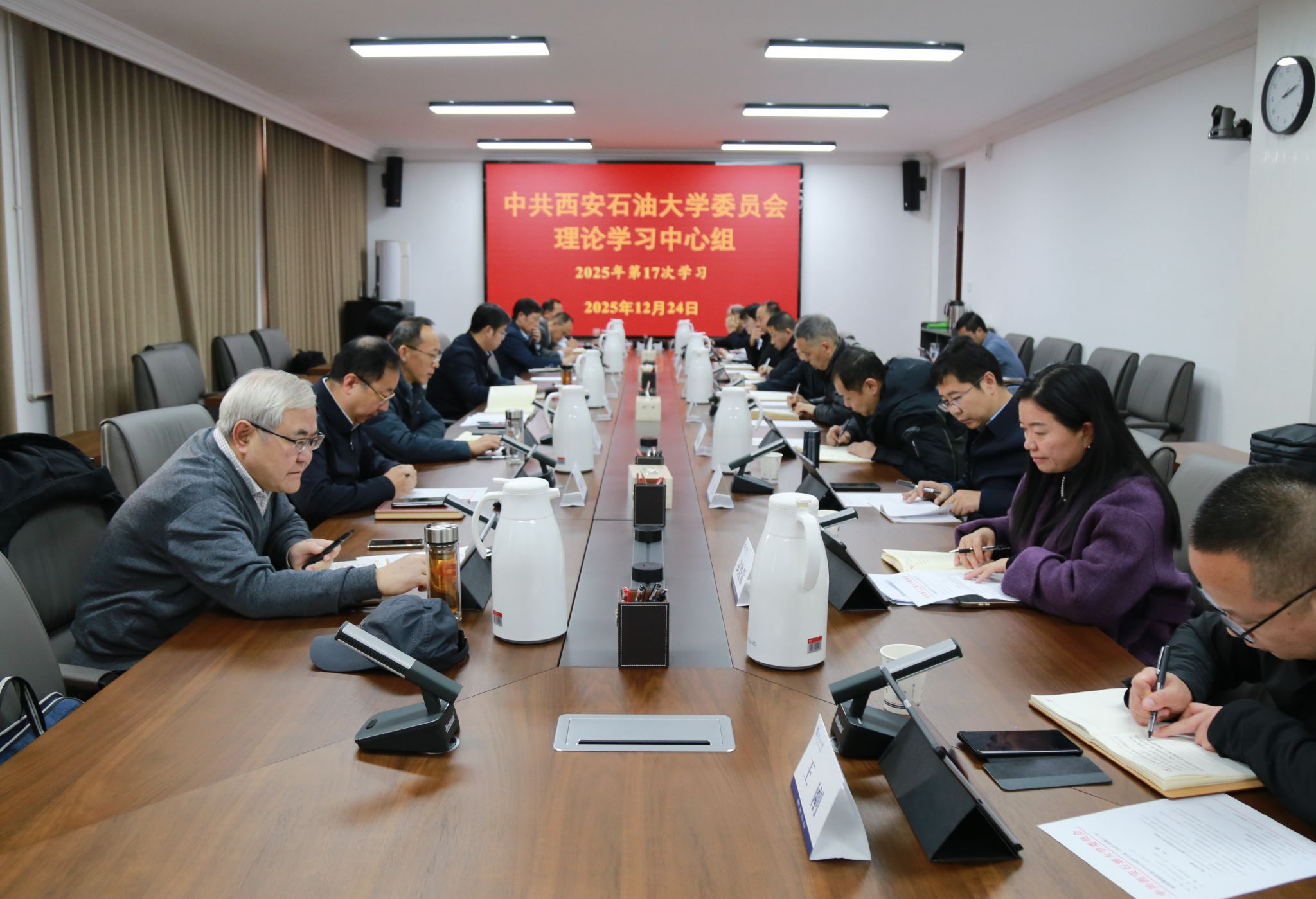 12月24日下午,校黨委理論學習中心組2025年第17次學習會在鄠邑校區(qū)第三會議室召開,深入學習領會習近平總書記關于全面依法治國、網(wǎng)絡強國建設、志愿服務等重要指示批示精神,學習中央重要會議精神和《習近平談治國理政》第五卷相關篇目等。校黨委副書記、校長王進富主持并講話,校黨委理論學習中心組成員參加會議。