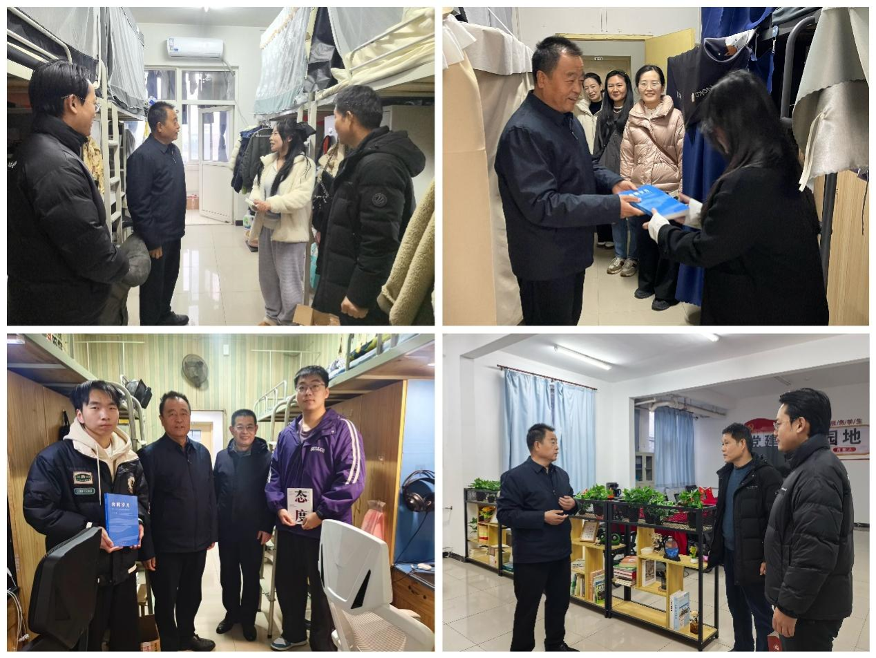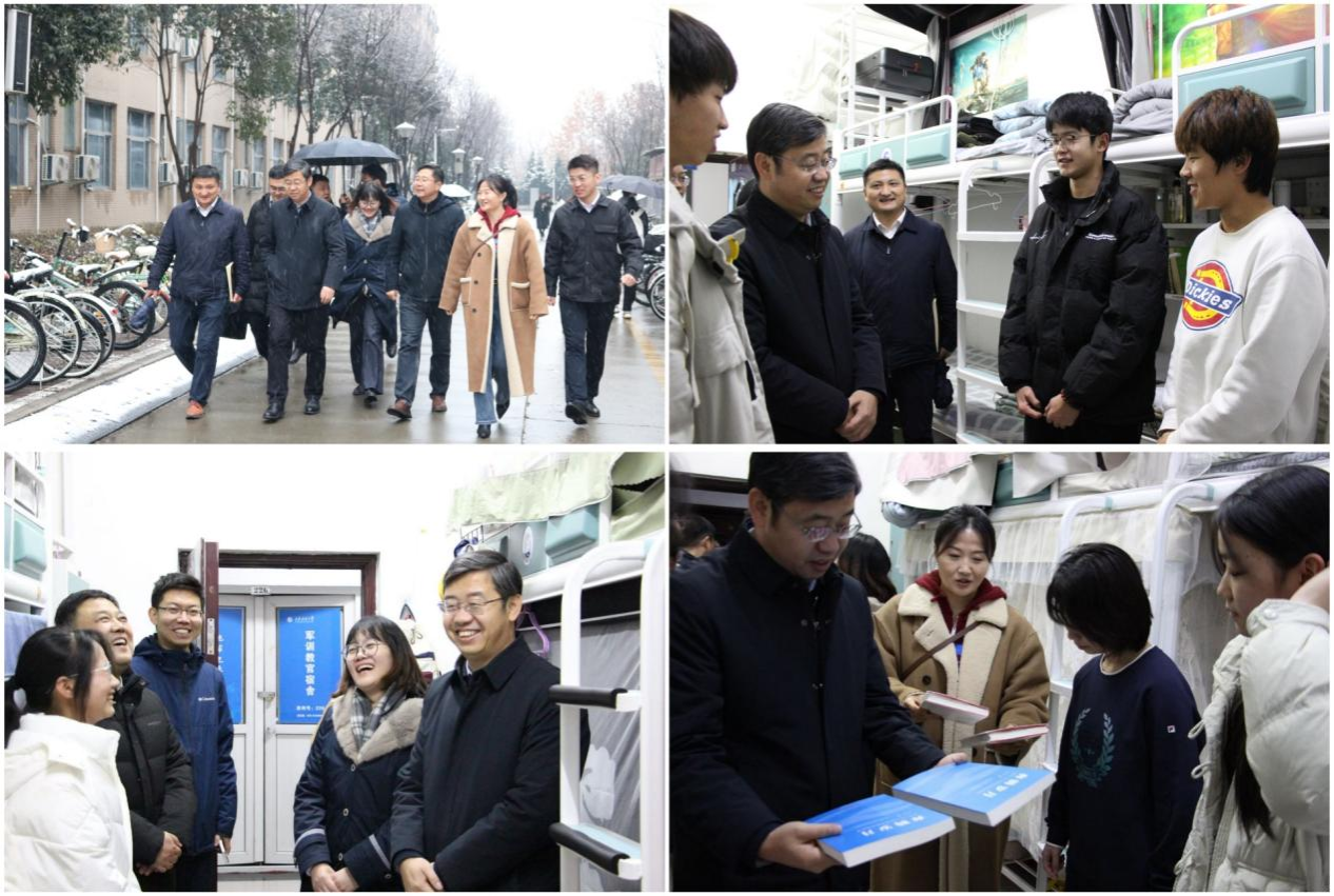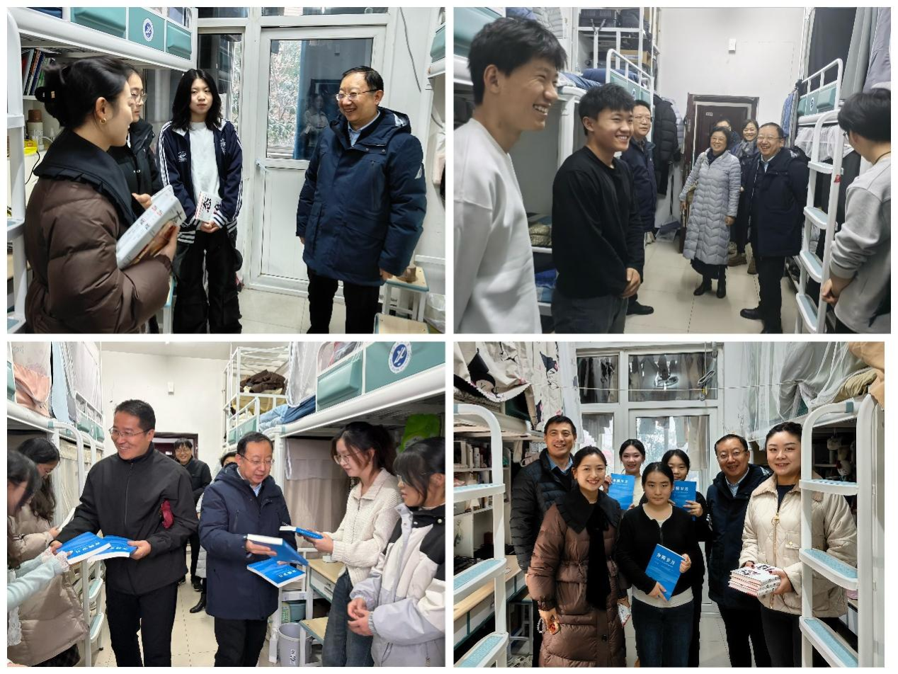 歲末迎新,暖意融融。在2026年元旦佳節(jié)來臨之際,學校領(lǐng)導深入各學院學生宿舍,走訪慰問留校學子,不僅通過贈送精心挑選的書籍、親筆書寫的對聯(lián)等方式,送上真摯的新年祝福,還與同學們親切暢談學習生活與未來規(guī)劃,傳遞學校的深切關(guān)懷與殷切期許,讓初雪籠罩的校園滿溢溫情。學生工作部(處)、研究生工作部以及各院(系)相關(guān)負責同志陪同走訪。