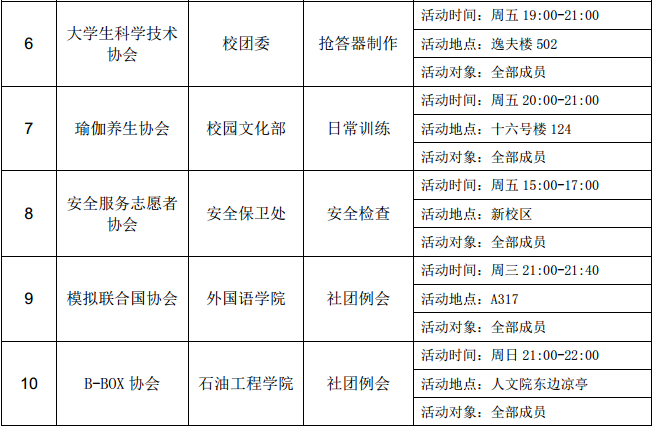 西安石油大學2016—2017學年第二學期第九周社團活動一覽表