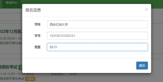 2、登錄成功后點(diǎn)擊“考試中心”,點(diǎn)擊對(duì)應(yīng)的場(chǎng)次“去報(bào)名”,填寫(xiě)好自己的個(gè)人信息,點(diǎn)擊確定后即可報(bào)名成功,要保證個(gè)人信息無(wú)誤,避免影響成績(jī)。(班級(jí)填寫(xiě)教學(xué)班,如B213)
