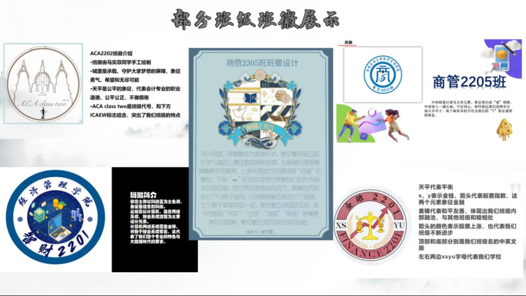 本次大賽參賽對象為學院2022級、2023級各班級,自11月初開始作品征集,鼓勵班級全體成員參與設(shè)計,群策群力,發(fā)揮自身特長。經(jīng)過首輪評審,共有11個班級進入決賽。在決賽中,各班以視頻、PPT、舞蹈、朗誦等形式全方位展示班級風采。商管2305班以初心如磐,行穩(wěn)致遠,堅定信仰,奮楫篤行作為他們的行為規(guī)范,“在青春路上盡情展現(xiàn)自我”是他們的班級特色,班歌《我的未來式》體現(xiàn)了商管2305班同學對未來的期望與憧憬,以及敢于追夢,爭取圓夢的斗志與激情。智財2201將“智勇雙全,愛拼財會贏”作為本班的班訓,班徽設(shè)計主體以科技藍為主色調(diào),象征著信息和科技,融合信息網(wǎng)絡(luò)系統(tǒng),財會系統(tǒng)流程等設(shè)計元素。國貿(mào)2202班以“嚴于律己,寬以待人”為關(guān)鍵詞,勉勵每一位同學變得更好,更加優(yōu)秀?!凹纫鐾强眨忠_踏實地”是他們的宣言。經(jīng)過激烈的角逐,商管2305班榮獲一等獎,智財2201班和國貿(mào)2202班榮獲二等獎,商務(wù)2301班、ACA2302班、商管2304班榮獲三等獎,商管2205班、金融2201班、ACA2202班、ACA2301班、商管2308班榮獲優(yōu)秀獎。