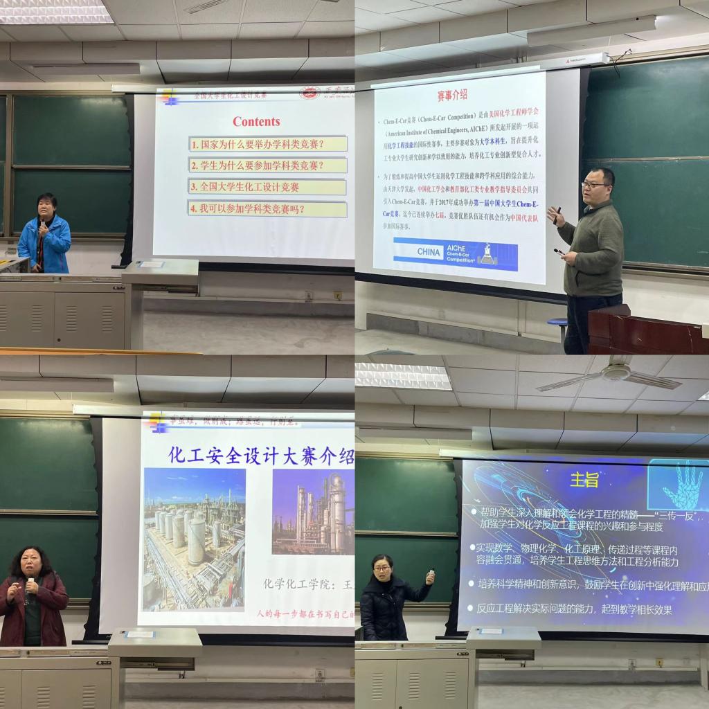 隨后,學(xué)科競(jìng)賽指導(dǎo)老師劉菊榮、范崢、王進(jìn)、唐璇依次就“全國(guó)大學(xué)生化工設(shè)計(jì)競(jìng)賽”“全國(guó)大學(xué)生化工實(shí)驗(yàn)大賽”“中國(guó)大學(xué)生Chem-E-Car競(jìng)賽”“全國(guó)大學(xué)生化工過(guò)程數(shù)字創(chuàng)新競(jìng)賽”“全國(guó)大學(xué)生化工安全設(shè)計(jì)大賽”“全國(guó)“互聯(lián)網(wǎng)+化學(xué)反應(yīng)過(guò)程”大學(xué)生課模設(shè)計(jì)大賽”等化工學(xué)科競(jìng)賽有針對(duì)性的介紹分析了競(jìng)賽概況、賽程與賽制、競(jìng)賽內(nèi)容、競(jìng)賽特點(diǎn)和我校以往獲獎(jiǎng)情況,鼓勵(lì)同學(xué)們積極參與,勇于嘗試,提升自己的專業(yè)和創(chuàng)新能力,努力在競(jìng)賽中取得新的突破。