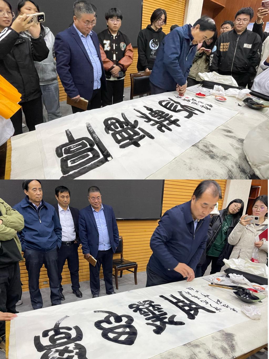 通過本次講座,同學(xué)們對于漢字發(fā)展歷史與書法欣賞有了進(jìn)一步的了解。講座結(jié)束之后,應(yīng)我院盛情邀請,兩位大篆文化研究大師在臺上揮毫潑墨,竇德盛老師寄語人文學(xué)院“厚德載物”,劉博老師則以“學(xué)思善用”與同學(xué)們共勉。漢字是中華文化的靈魂和根基,也是傳承中華文化的載體。堅(jiān)持書法進(jìn)校園,一定會讓中華傳統(tǒng)文化之樹再度結(jié)出豐碩的果實(shí)。