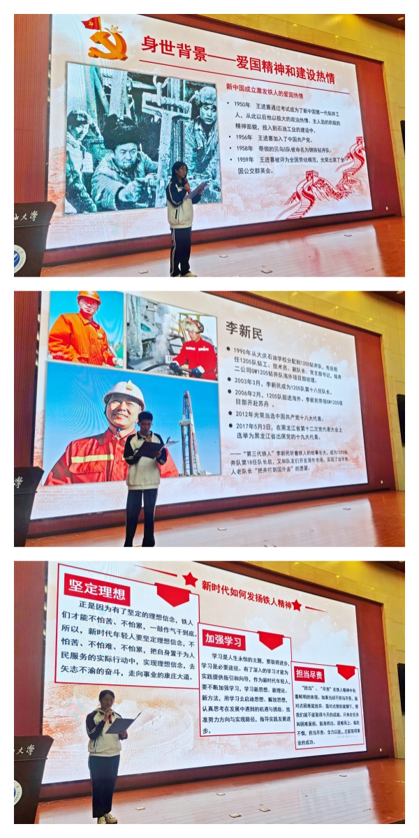 在“學(xué)子講鐵人”環(huán)節(jié),由高年級(jí)的郭容容、楊盛凱和黃一凡同學(xué)分別從鐵人身世背景、國(guó)內(nèi)國(guó)際戰(zhàn)略背景以及油田惡劣的自然環(huán)境分析了鐵人精神涵育的時(shí)代背景,從王進(jìn)喜、王啟明和李新民的人物人物事跡講述了一脈相承的鐵人精神,從鐵人精神的重要意義、作用和傳播途徑分享了當(dāng)代大學(xué)生對(duì)鐵人精神發(fā)揚(yáng)的思考和感悟。并號(hào)召同學(xué)們?cè)诮窈蟮膶W(xué)習(xí)生活中以鐵人精神為引領(lǐng),將本次學(xué)習(xí)內(nèi)化于心、外化于行。