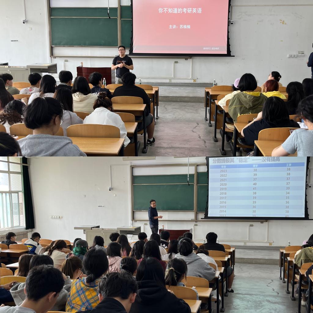 報(bào)告會(huì)上,蔡乾鋒老師結(jié)合自己的人生經(jīng)歷分析當(dāng)前社會(huì)發(fā)展形勢(shì)變化,就考研院校選擇、備考具體事宜、考研注意事項(xiàng)三方面進(jìn)行了詳細(xì)講解,引導(dǎo)同學(xué)們搜集信息、合理報(bào)考學(xué)校和專業(yè),依據(jù)自身的學(xué)習(xí)情況確立適當(dāng)?shù)膱?bào)考目標(biāo),幫助同學(xué)們規(guī)避考研常見風(fēng)險(xiǎn),勉勵(lì)同學(xué)們認(rèn)真踏實(shí)復(fù)習(xí)、科學(xué)選擇學(xué)校、積極應(yīng)對(duì)考試,希望同學(xué)們能夠全力以赴,認(rèn)真?zhèn)淇?。隨后,蘇楠楠老師從考研英語(yǔ)宏觀形勢(shì)、題型構(gòu)成、備考重點(diǎn)和高效復(fù)習(xí)計(jì)劃等方面,展開了系統(tǒng)全面的分析和講解,一方面提高了學(xué)生對(duì)考研英語(yǔ)的認(rèn)知,另一方面,為學(xué)生指明了考研英語(yǔ)備考的大方向。