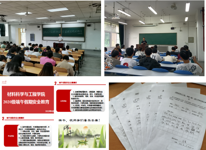 為進一步強化同學們的安全意識,強化同學的安全意識,構(gòu)建和諧安全的校園環(huán)境,使同學們度過一個安全愉快的假期。根據(jù)學校和學院學生工作教育安排部署,6月19日—21日,材料科學與工程學院各年級通過線下和線上相結(jié)合的方式開展端午假期安全教育活動。