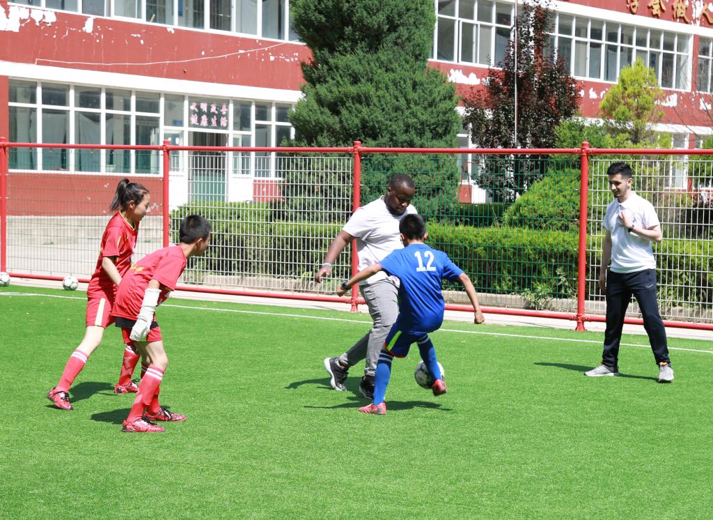 在直羅小學,留學生們?yōu)樾W生們帶來了有趣生動的英語口語課。實踐教學活動是“感知中國”活動重要組成部分,在互動課堂上,小學生們與來自不同國家的留學生互動交流,來自馬來西亞的詠翰分別用中文、英文、馬來西亞語給小學生們教了生日祝福歌,來自哈薩克斯坦的小云用圖畫、猜謎游戲為小學生們上了一堂生動活潑的英語課。有趣的英語課堂激發(fā)了小學生學習英語的熱情和濃厚的興趣,課堂氣氛熱烈,同學們發(fā)言踴躍,一節(jié)課下來小學生們意猶未盡。英語課堂外,是以“傳播快樂足球”為主題的足球互動活動,留學生與小學生們開展了一場足球友誼賽。場上,參賽隊員們齊心協(xié)力,奮勇拼搏。帶球、護球、傳球、射球,動作嫻熟,拼勁十足。就這樣,初次來到直羅小學的留學生們感受到了當?shù)氐娘L土人情,并對接下來與孩子們的相遇充滿了期待?;顒又?,我校專程為直羅小學帶去了50本捐贈圖書和5個嶄新足球。