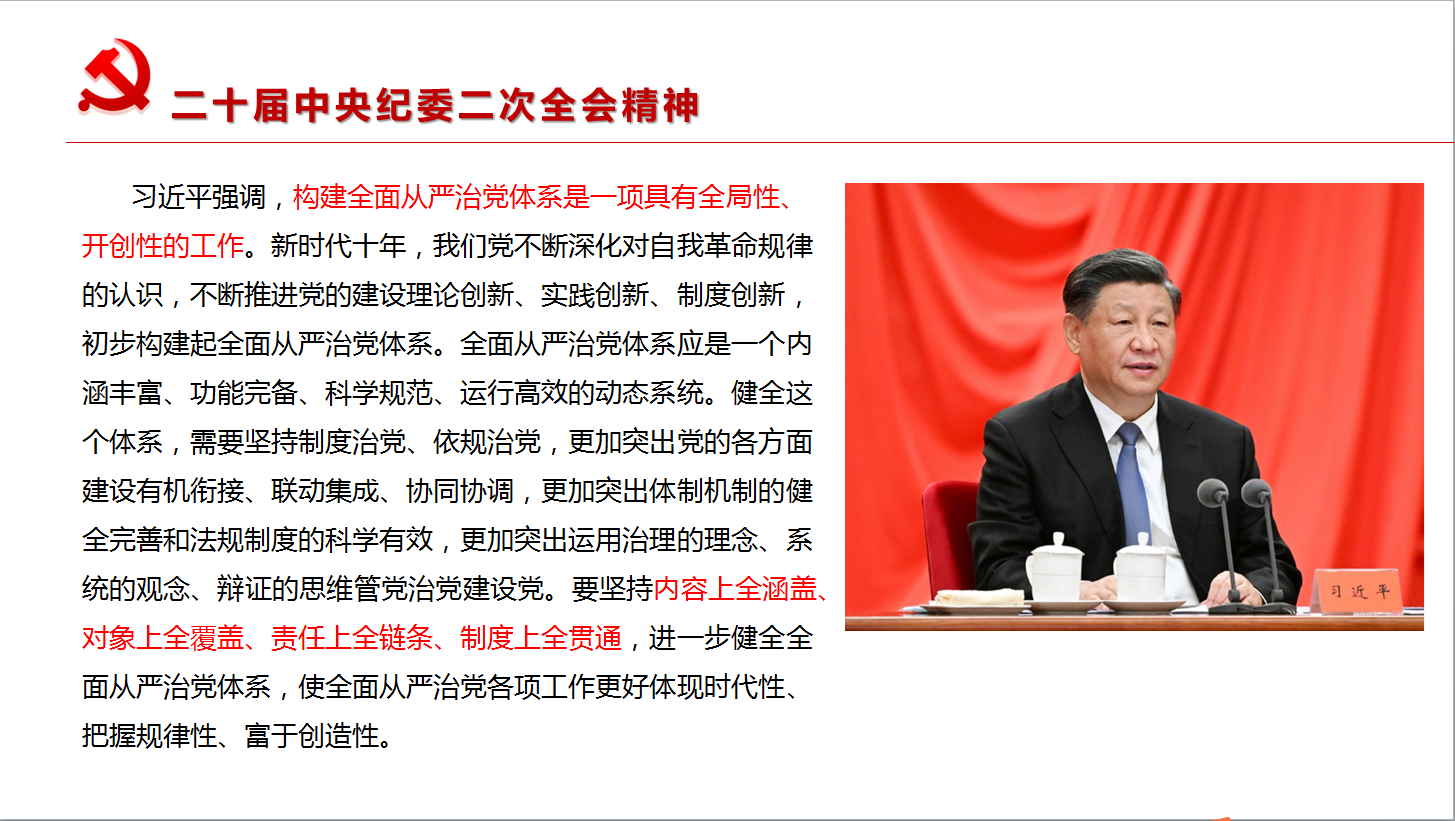 最后,紀(jì)檢委員賈莉娜領(lǐng)學(xué)了二十屆中央紀(jì)委二次會議精神,詳細(xì)介紹了習(xí)近平總書記在二十屆中央紀(jì)委二次全會上的重要講話相關(guān)內(nèi)容,以及李希同志在中國共產(chǎn)黨第二十屆中央紀(jì)律檢查委員會第二次全體會議上的工作報告相關(guān)內(nèi)容。