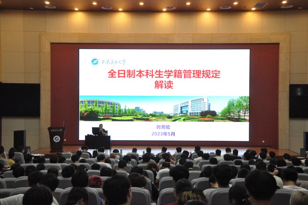 為進一步使在校生詳細了解學校關于學籍管理的相關規(guī)定,保障學生的合法權益,從校規(guī)校紀嚴格要求學生,加強學生間的學風建設,石油工程學院于5月24日下午、晚上在西安石油大學鄠邑校區(qū)學術報告廳進行兩場全日制本科生學籍管理規(guī)定解讀講座,主講人為教務處副處長馬加傳、教務處教務科科長張浩,2021級輔導員秦馨雨、2022級輔導員聶康晨主持本次講座,2021級、2022級全體學生參加本次講座。