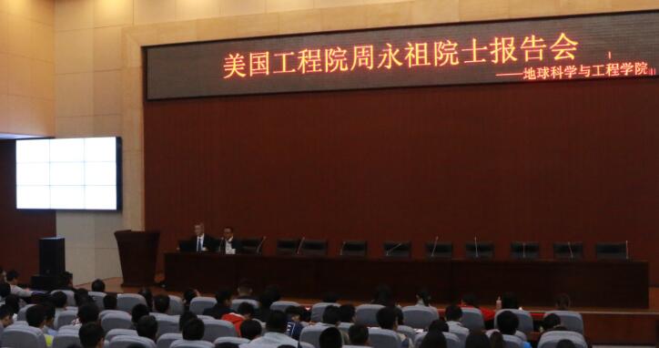 2018年3月30日上午10:00,應(yīng)地球科學(xué)與工程學(xué)院邀請,美國工程院院士周永祖教授來校進行學(xué)術(shù)交流,在鄠邑校區(qū)弘石學(xué)術(shù)報告廳為本科學(xué)生作學(xué)術(shù)報告。報告會由地球科學(xué)與工程學(xué)院副院長李輝峰教授主持,楊韡教授擔(dān)任翻譯,院黨委副書記李慶本老師、物探系程希副教授及各年級學(xué)生近400人參加報告會。