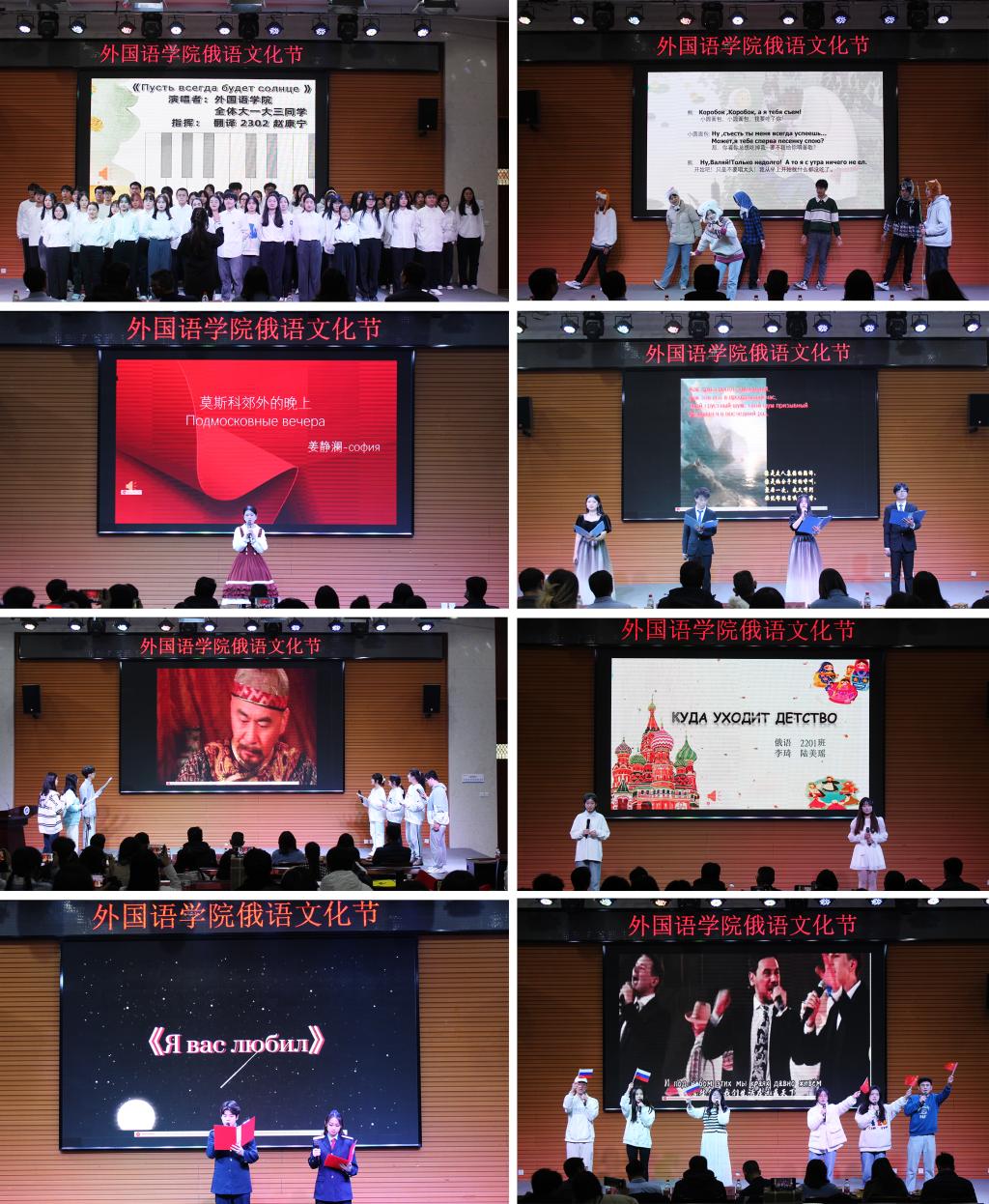 本屆俄語(yǔ)文化節(jié)由俄語(yǔ)歌曲串燒、普希金詩(shī)歌朗誦、俄語(yǔ)短劇表演、影視短劇翻譯配音表演以及外語(yǔ)書(shū)法大賽等環(huán)節(jié)組成?;顒?dòng)現(xiàn)場(chǎng)熱鬧非凡,節(jié)目題材豐富、精彩紛呈,有機(jī)融合了中國(guó)和俄羅斯文化元素。俄語(yǔ)專(zhuān)業(yè)學(xué)生用明快、激昂的大合唱拉開(kāi)了俄語(yǔ)文化節(jié)的序幕;詩(shī)朗誦《致大海》,讓大家感受到普希金追求光明、謳歌自由的思想情感;話劇《小圓面包》,用可愛(ài)豐富的肢體語(yǔ)言和流利的口語(yǔ)表現(xiàn)出學(xué)生良好的俄語(yǔ)語(yǔ)言功底;翻譯配音影視劇片段《甄嬛傳》和《功夫熊貓》將活動(dòng)氣氛推向高潮;俄語(yǔ)歌曲串燒《幸福鳥(niǎo)》、《莫斯科郊外的晚上》、《致青春》唱出了俄語(yǔ)專(zhuān)業(yè)學(xué)生朝氣蓬勃的精神風(fēng)貌;由西安鐵路職業(yè)技術(shù)學(xué)院的學(xué)生帶來(lái)的詩(shī)朗誦《我曾經(jīng)愛(ài)過(guò)你》以及俄語(yǔ)歌曲《小鬧鐘》讓大家眼前一亮;詩(shī)朗誦《假如生活欺騙了你》將普希金語(yǔ)言的魅力展露無(wú)遺;匯演在俄語(yǔ)專(zhuān)業(yè)2021級(jí)學(xué)生帶來(lái)的歌舞劇《冬日》中落下帷幕。