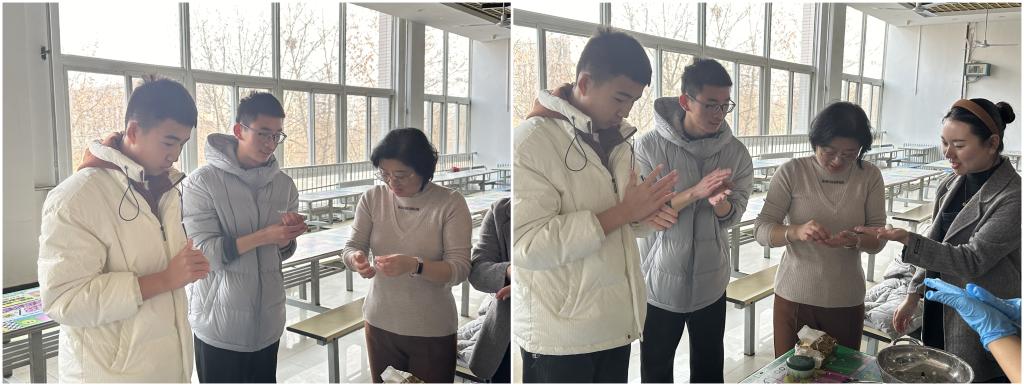 學(xué)工干部提前準(zhǔn)備好糯米粉、黑芝麻等材料,活動(dòng)現(xiàn)場(chǎng)師生們有說(shuō)有笑,同學(xué)們大都是零基礎(chǔ)的新人,在老師和后勤阿姨們的指點(diǎn)下熟手帶新人,相互交流著包湯圓的訣竅和技法。