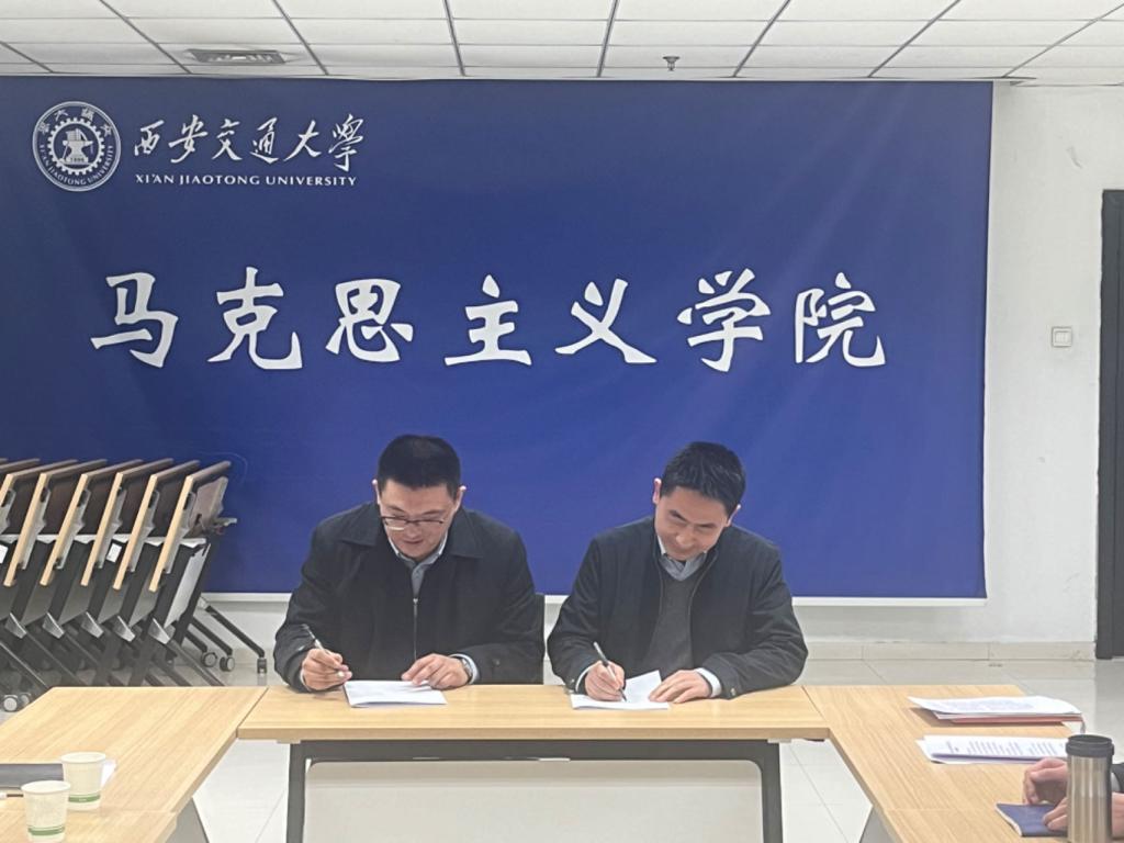 為全面貫徹習近平總書記關于思政課建設的重要論述,落實中共中央辦公廳印發(fā)的《關于加強新時代馬克思主義學院建設的意見》要求,發(fā)揮全國和省級重點馬克思主義學院示范帶動作用,根據(jù)《陜西省高校重點馬克思主義學院對口幫扶普通馬克思主義學院機制》(陜教工宣辦〔2021〕15 號)文件精神。3月1日下午,我校馬克思主義學院張海濤院長一行走訪西安交通大學馬克思主義學院,舉行西安交通大學馬克思主義學院對口幫扶我校馬克思主義學院簽約儀式,西安交通大學馬克思主義學院院長燕連福和我院院長張海濤代表雙方簽約。簽約儀式之前,雙方舉行了座談會。