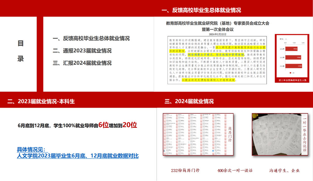 會上,黨委副書記盛丹帶領大家學習了教育部、教育廳關于畢業(yè)生就業(yè)文件精神,并分析全省高校畢業(yè)生總體就業(yè)情況,對2023屆畢業(yè)生就業(yè)去向落實過程進行分析,指出工作中存在的問題和主客觀原因。接著,她介紹了學院目前針對2024屆畢業(yè)生就業(yè)所做工作,詳細通報了目前學生的考研初試情況,并分專業(yè)展示了畢業(yè)指導老師所帶學生就業(yè)完成率,希望各位導師在督促學生完成畢業(yè)論文的同時,抓住畢業(yè)前的就業(yè)機會,盡早確定去向。