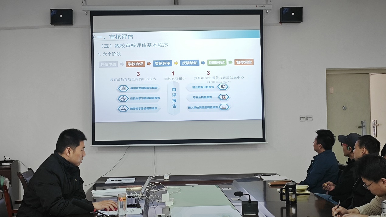 會議第二項,李慶本帶領全體教職工開展本科教育教學思想大討論專題學習。他向全體教職工講解了新一輪教育教學審核評估的背景意義、指導原則、指標體系等方面內(nèi)容,重點介紹了我校新一輪審核評估工作的工作部署、基本程序、準備工作以及教職工應知應會等方面的知識內(nèi)容。